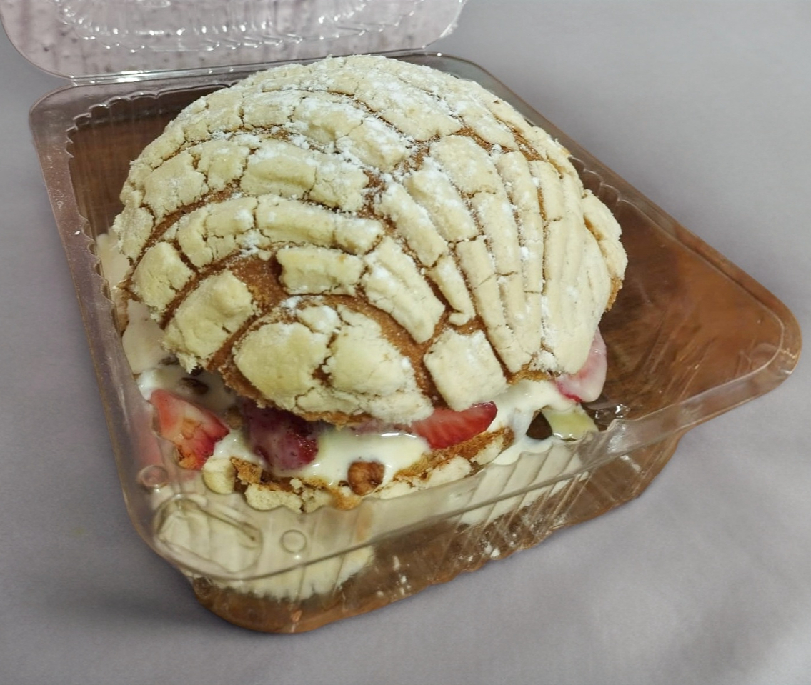 Concha rellena de crema de la de fresas con crema u otra fruta de tu elección.