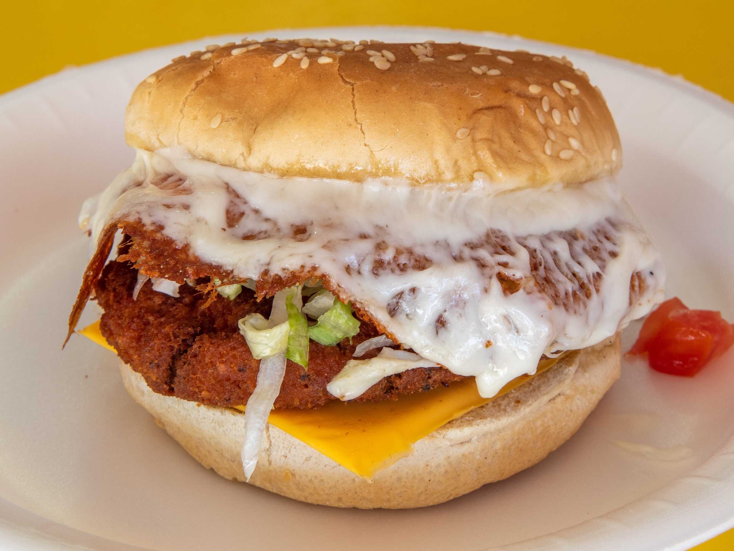 Queso amarillo, queso asadero, jamón y pan de hamburguesa.