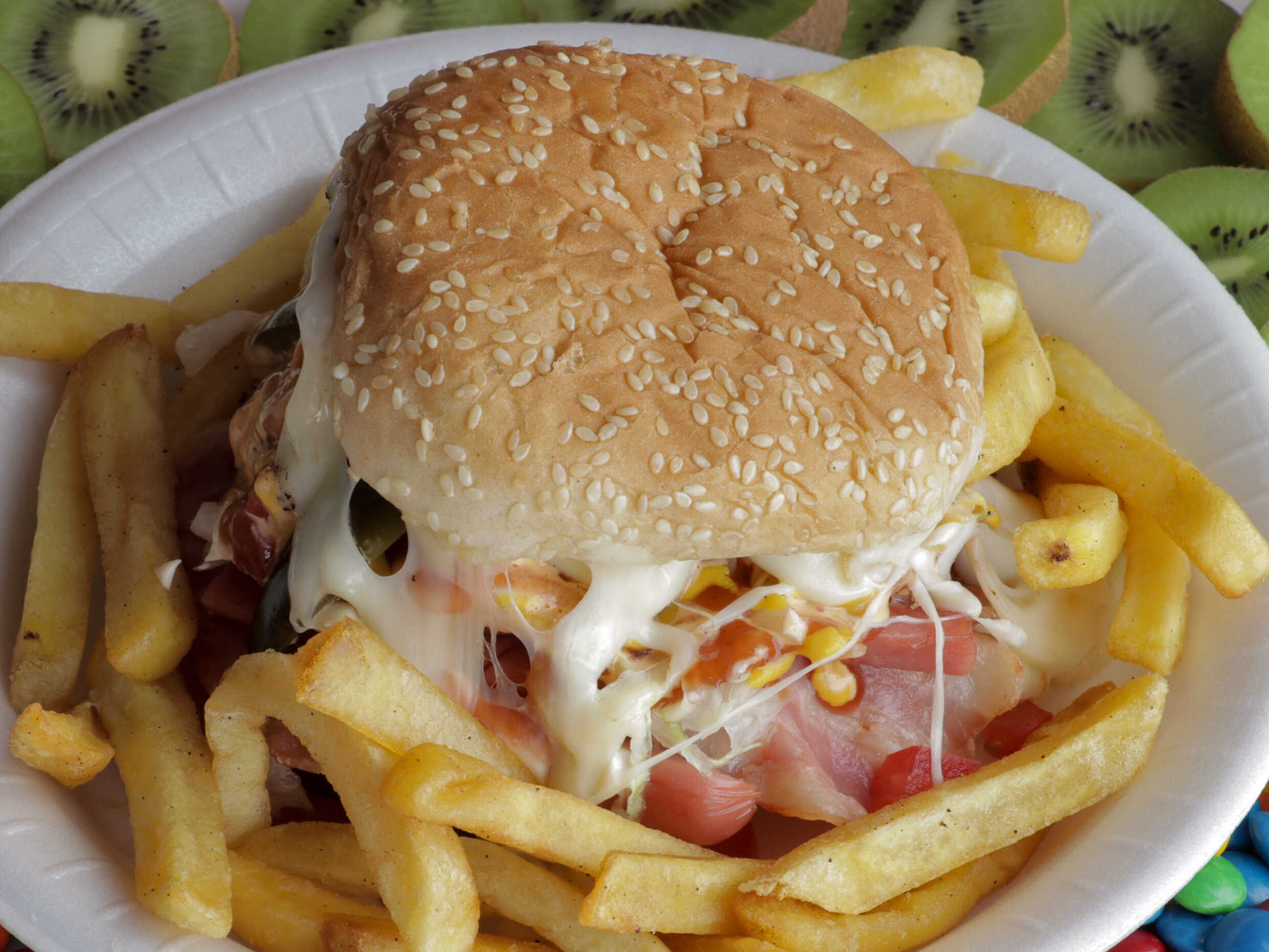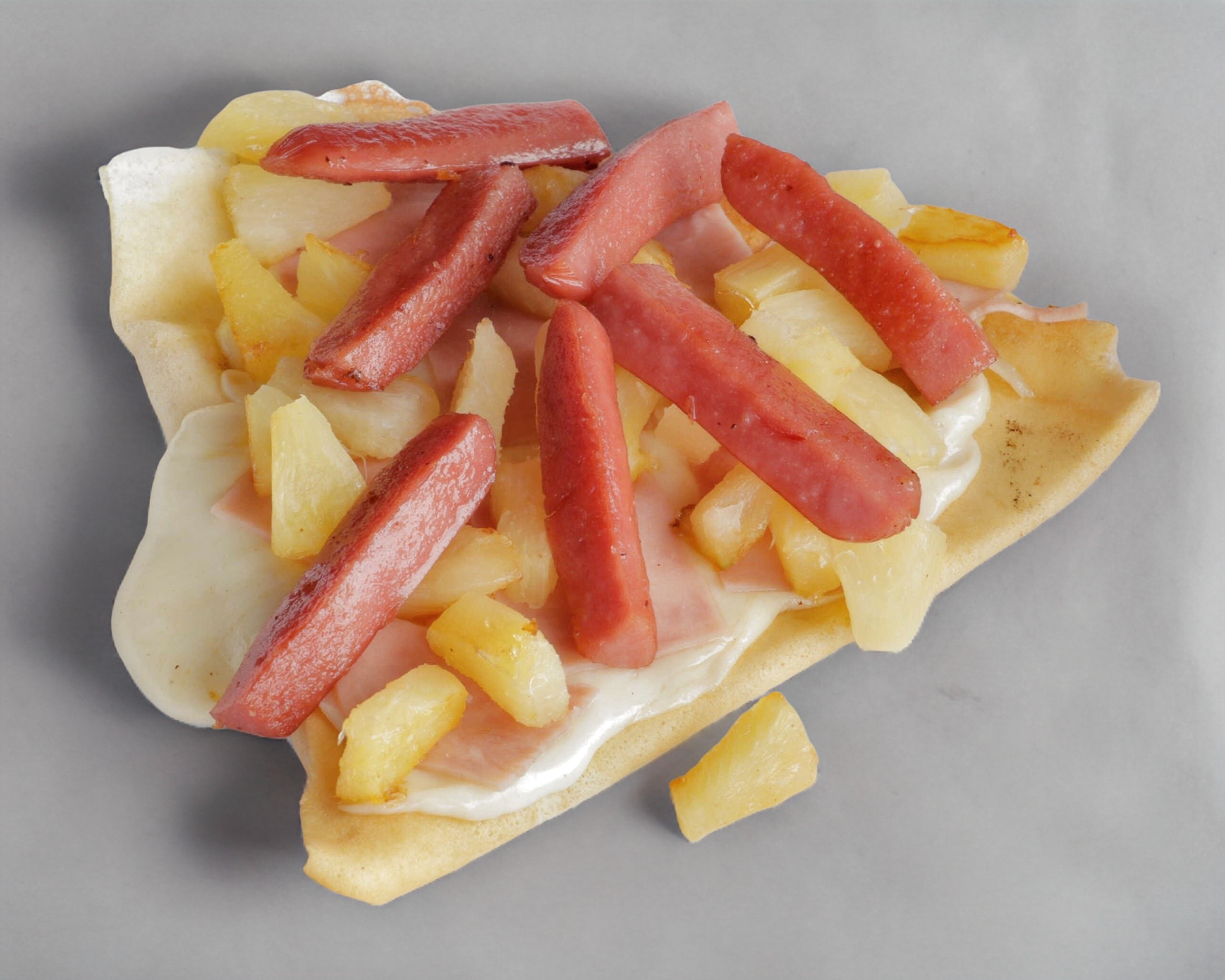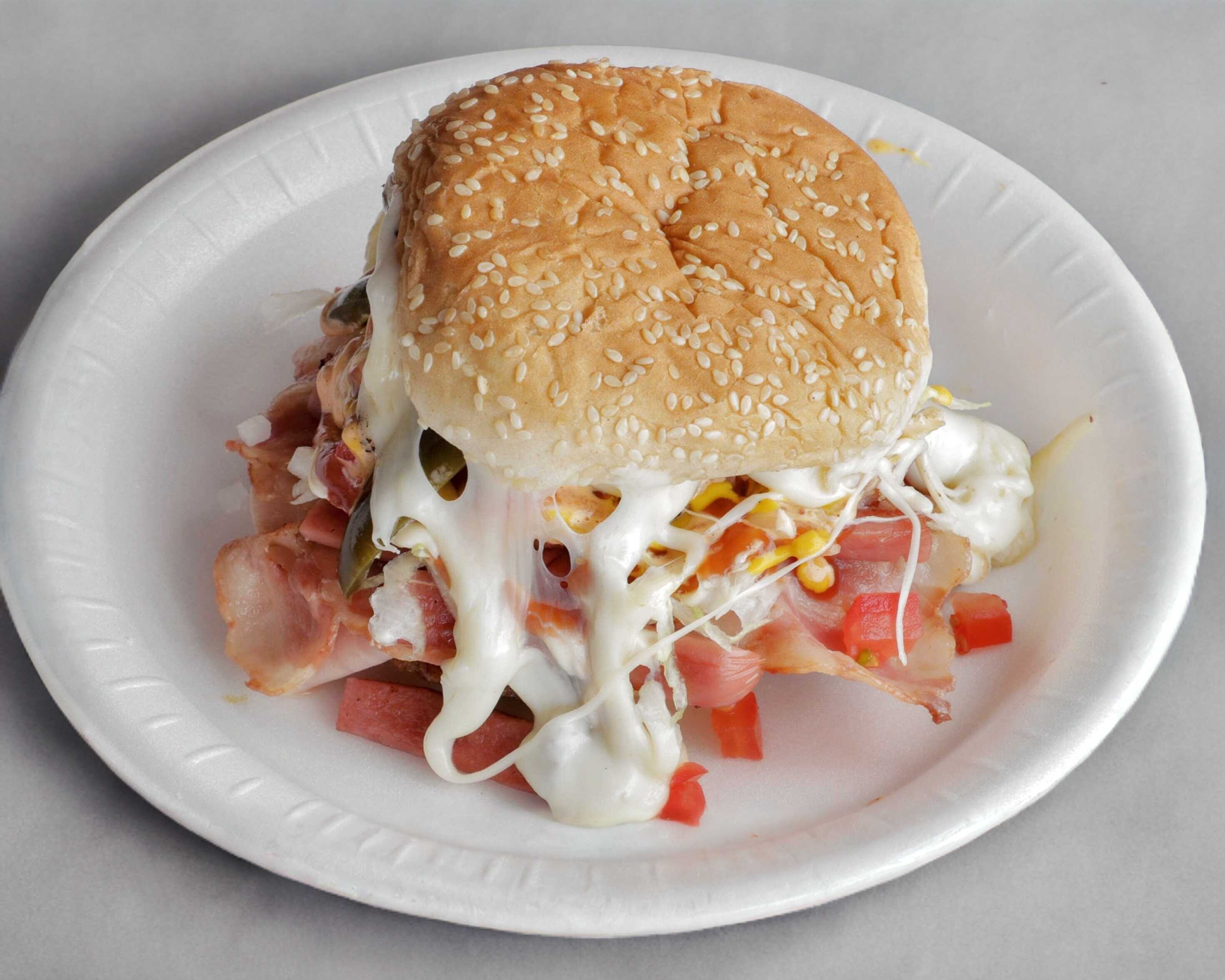 Queso asadero, jamón, queso amarillo, tocino, carne de hamburguesa y salchicha.