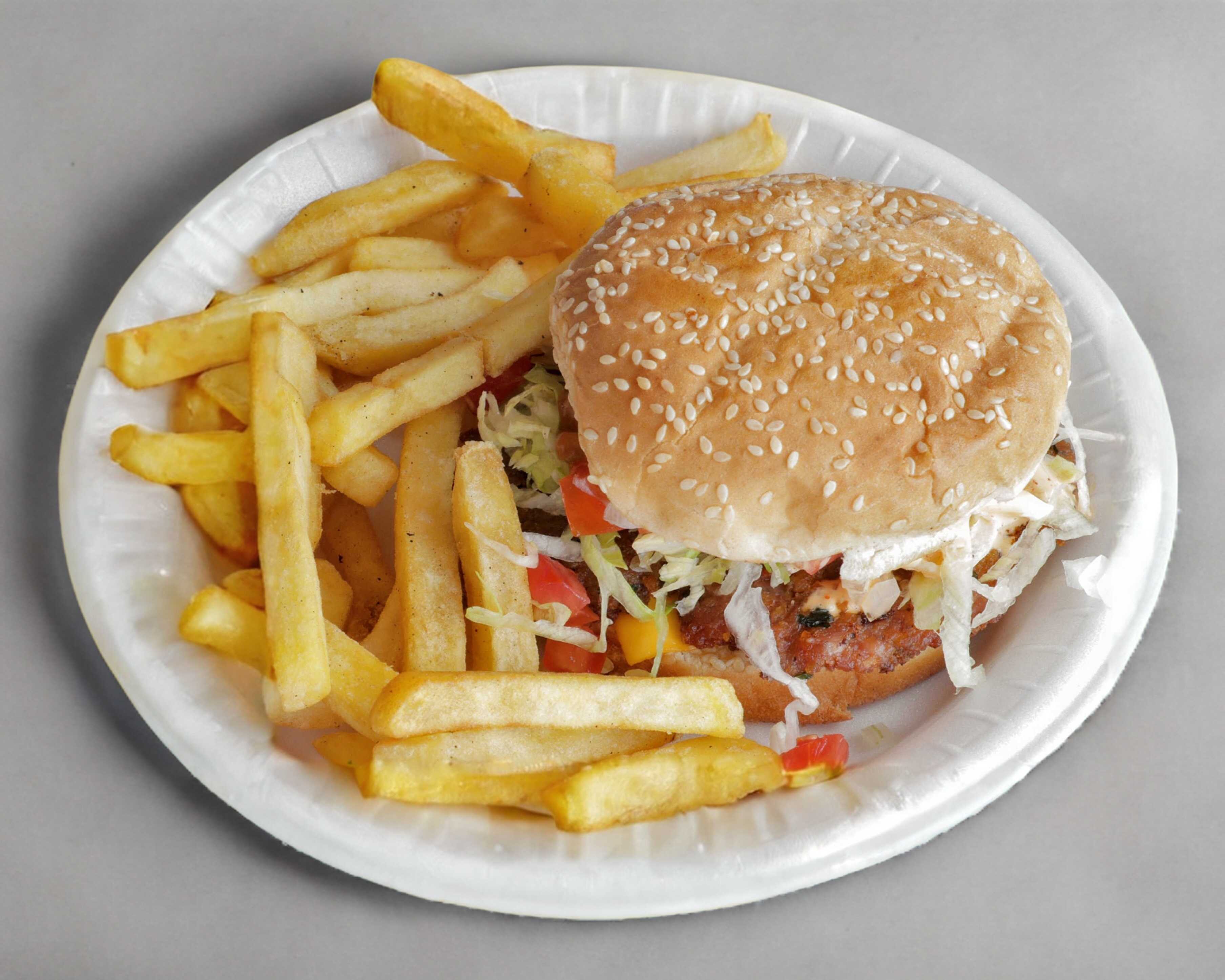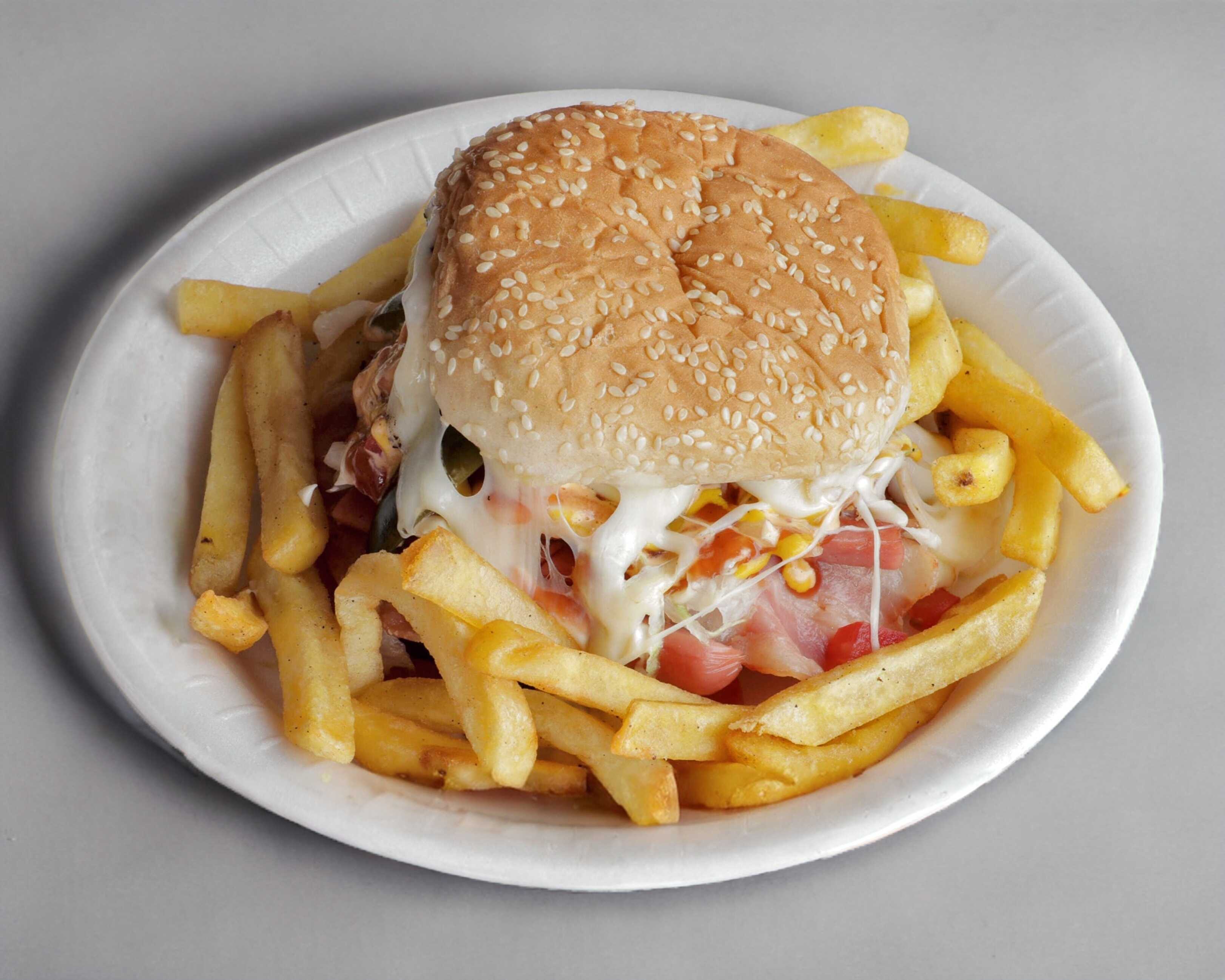 Hamburguesa tradicional con pan clásico, carne 100% de res (100 g), tomate, lechuga, aderezos y jalapeños. Acompañada de papas a la francesa (aprox. 150 g).