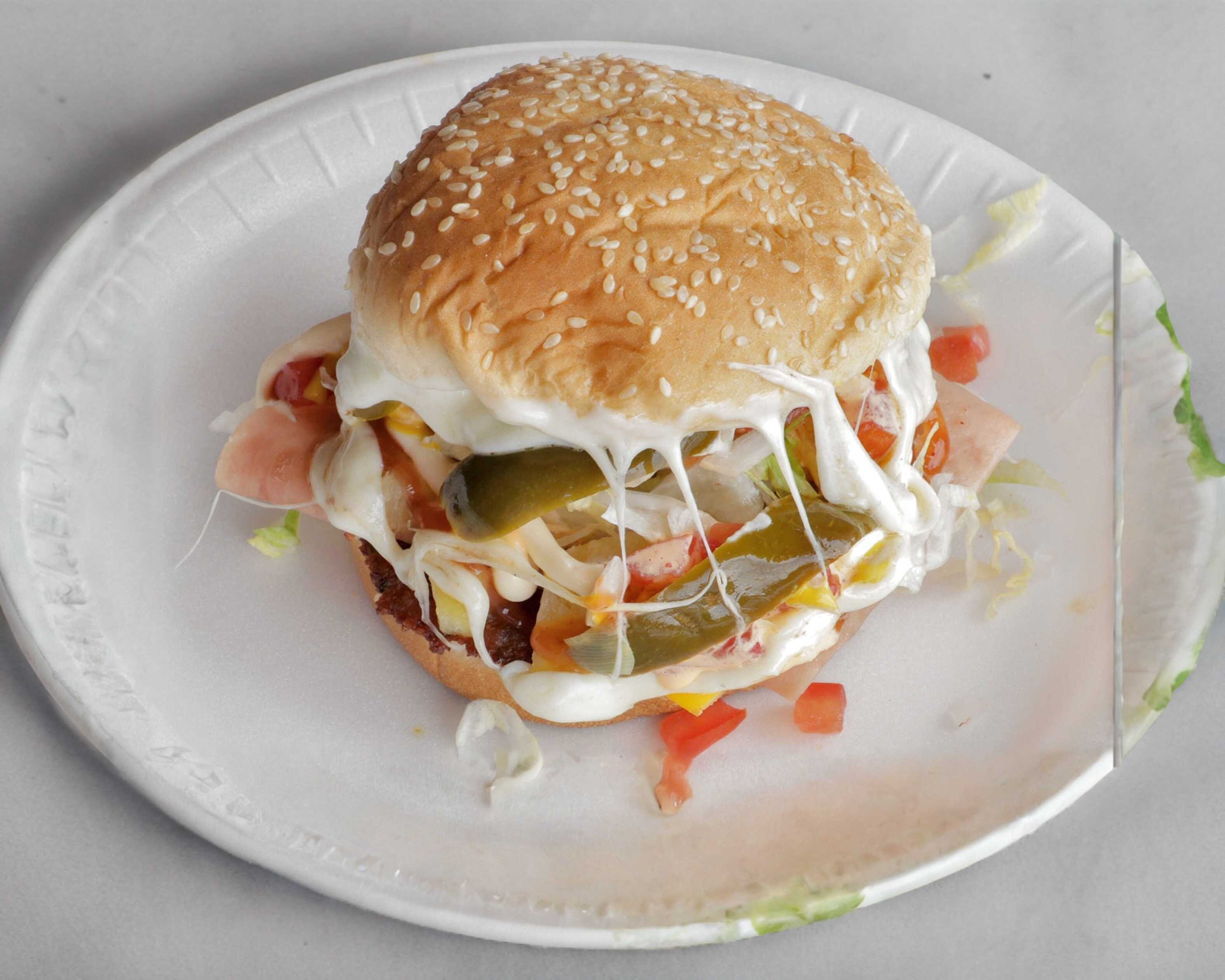 Queso amarillo, queso asadero, jamón y pan de hamburguesa.