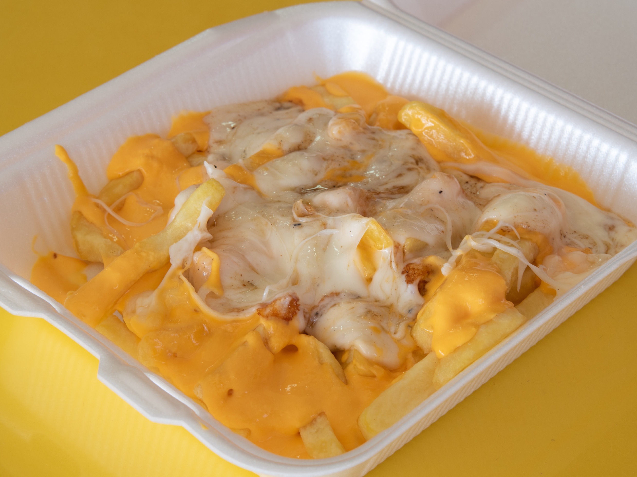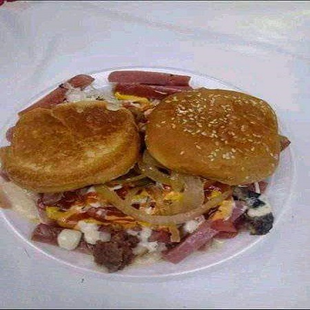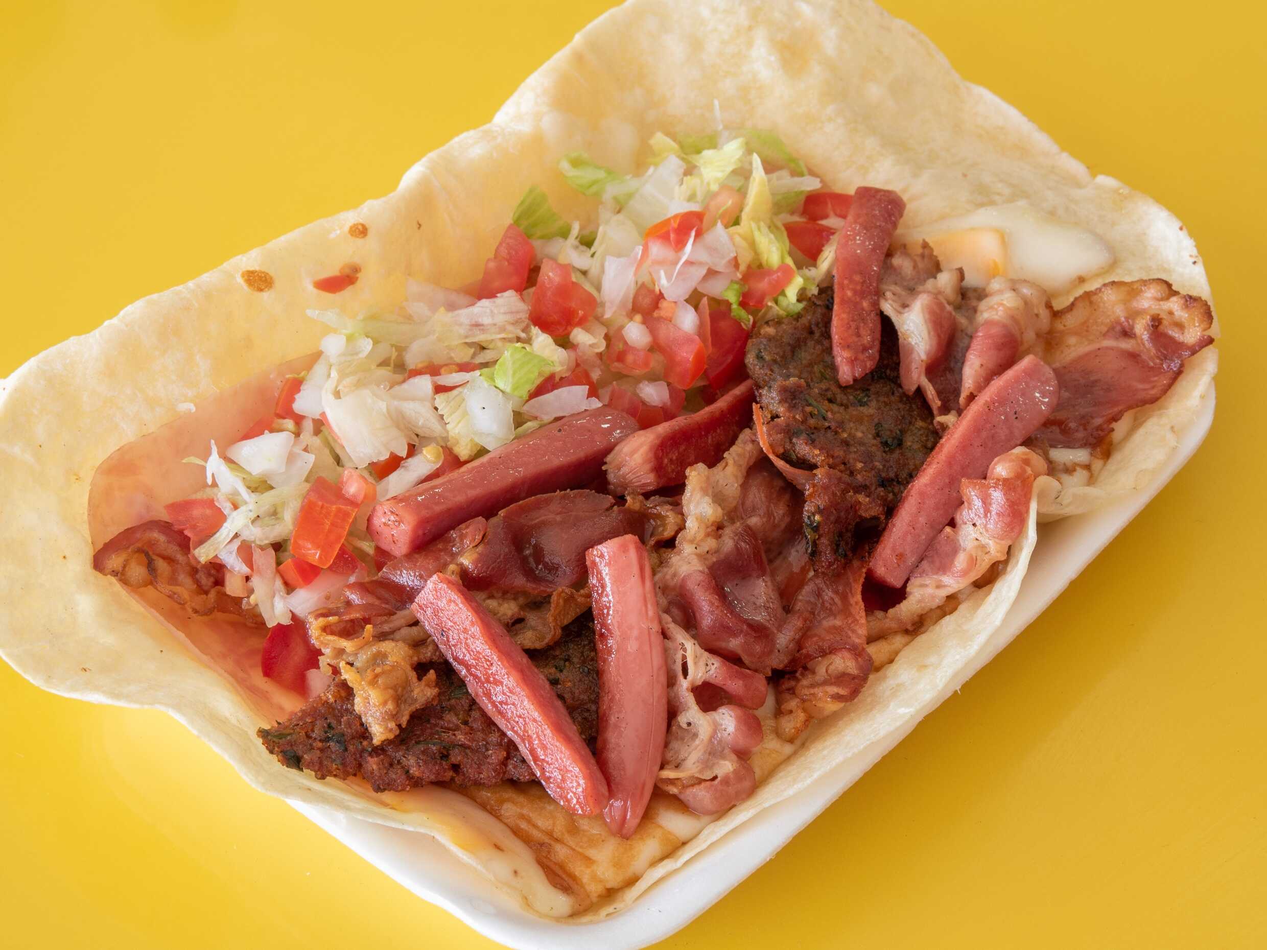 Carne, queso asadero, jamón, queso amarillo, salchicha, tocino y doritos.