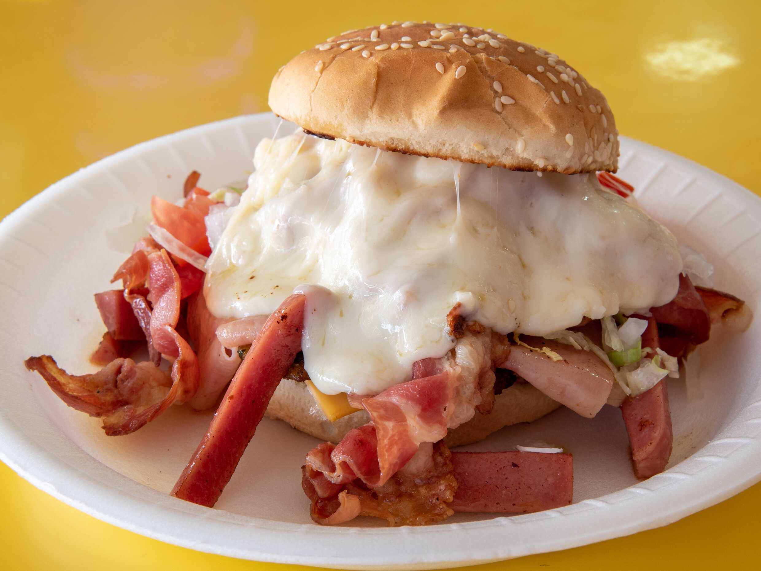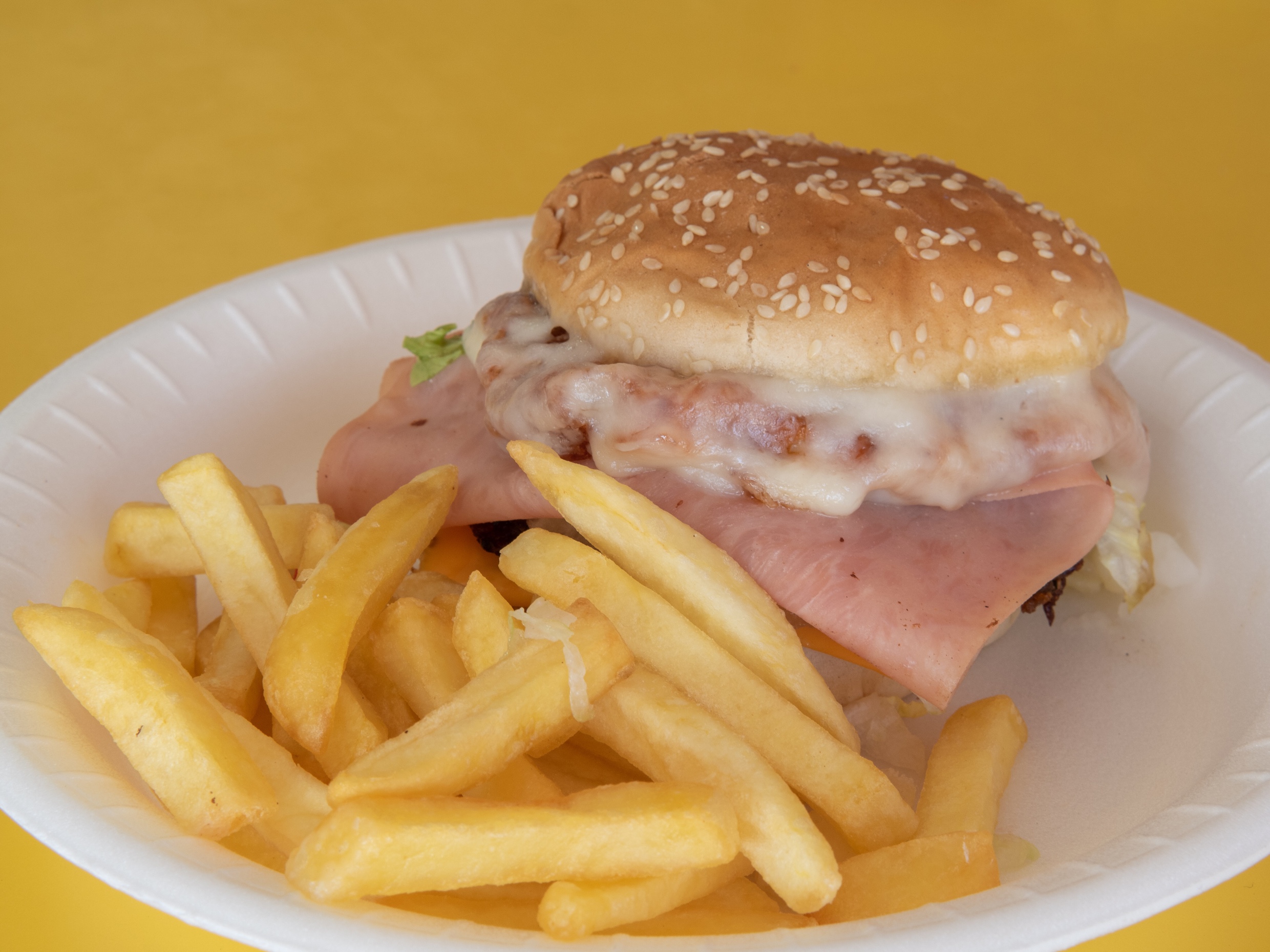 Queso amarillo, queso asadero, jamón y pan de hamburguesa.