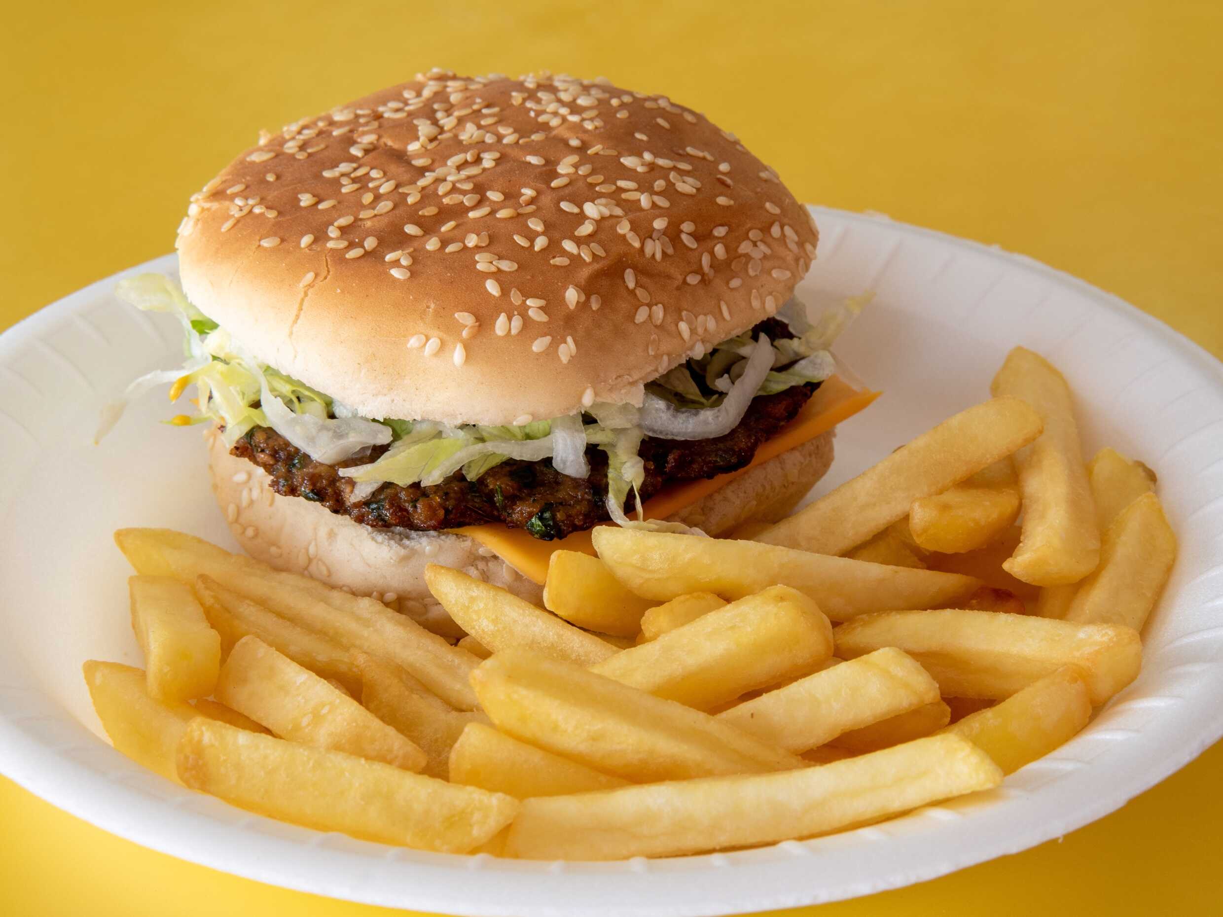Hamburguesa Sencilla pan tradicional, carne de res cebolla tomate lechuga y aderezos con Papas a la francesa