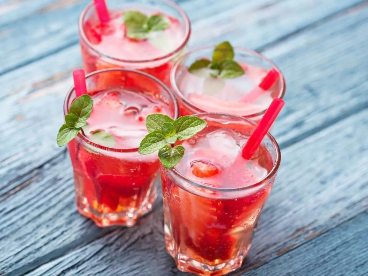 Bebida a base de agua mineral, jarabe de frambuesa, fruta y perlas explosivas.
