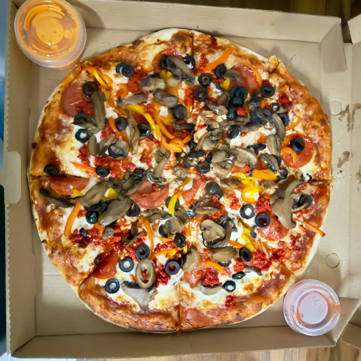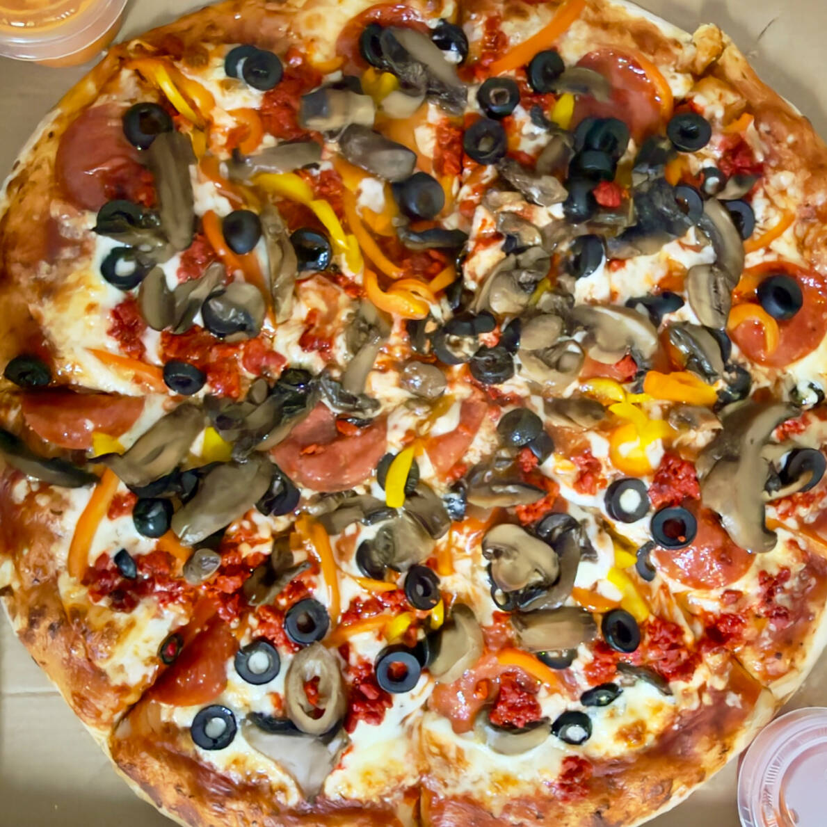 Pepperoni, chorizo, champiñones, aceitunas negras, pimiento morrón y Queso 100% Mozzarella, porción para 3 o 4 personas