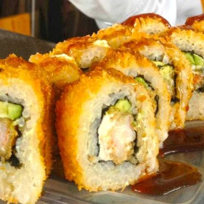 Rollo frito con tu elección de proteína (camarón, surimi o vegetariano) por dentro, con salsa chipotle sobre encima.