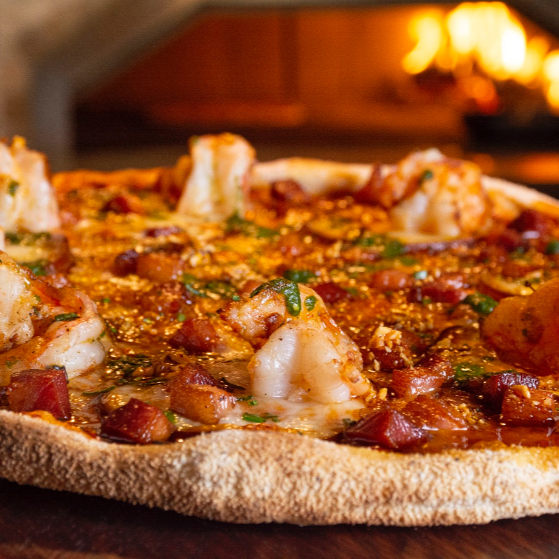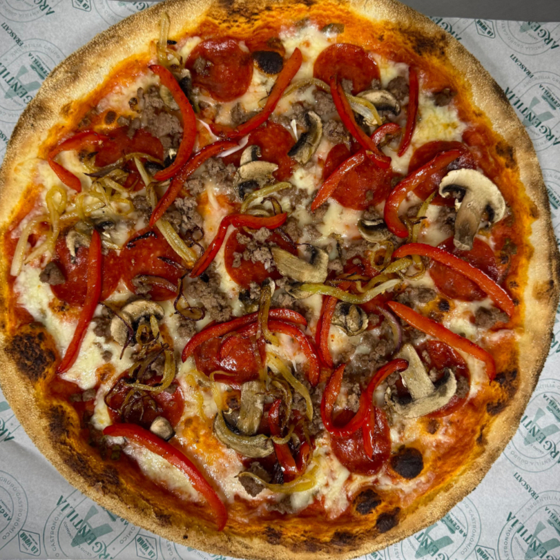 Pepperoni, pimientos y champiñones rostizados, cebolla morada, carne de res estofada, queso provolone y emulsión de habanero