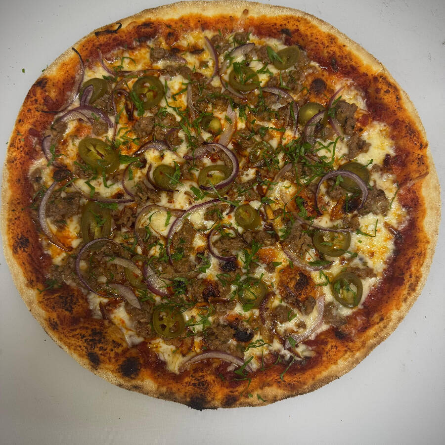 Salsa pomodoro macha, queso ahumado, carne de res importada a la mexicana, cebolla morada, jalapeño y cilantro