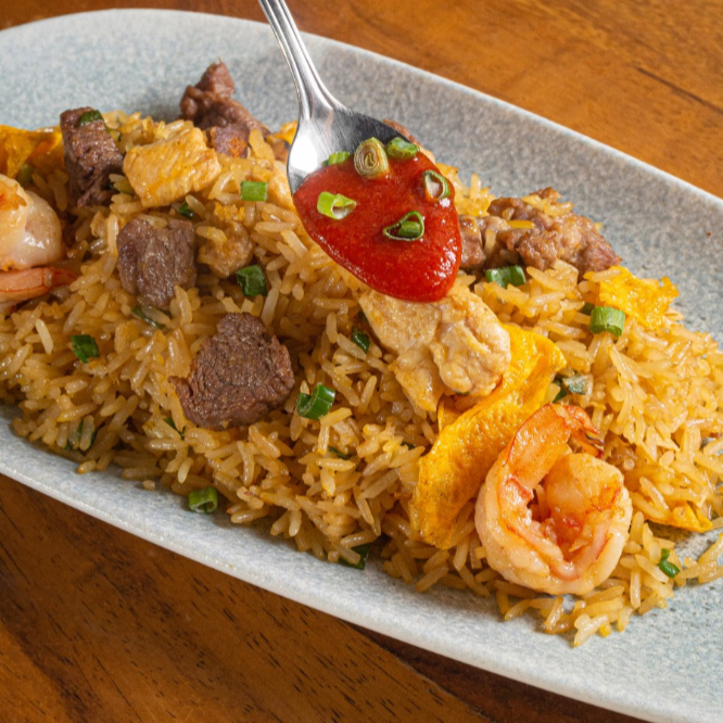 Clásico de Argentilia con camarón (50 gm), filete de res (50 gm), pollo (50 gm) y salsa soya.