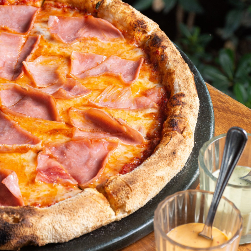 Salsa pomodoro, queso Monterrey Jack y jamón de cerdo.