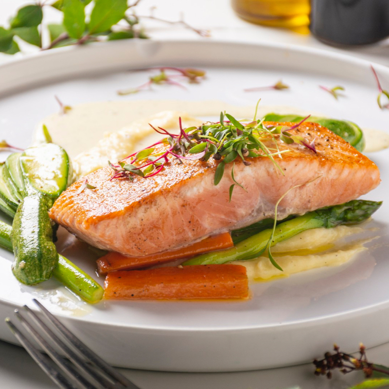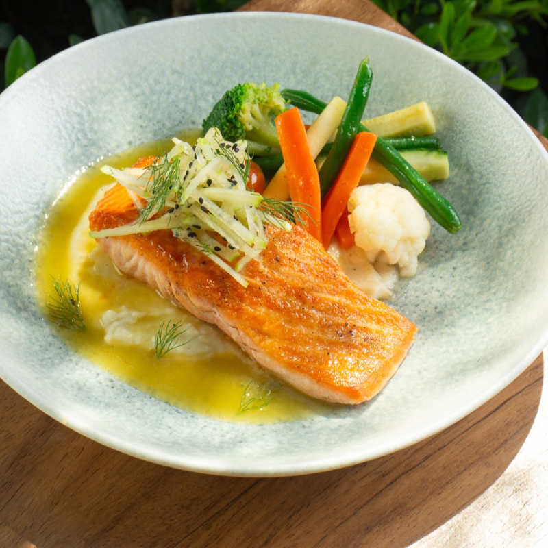 Con mantequilla de eneldo, puré de papa y vegetales salteados.