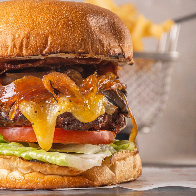 Carne (160 gramos) angus a la parrilla, queso Monterrey Jack, cebolla caramelizada, tocino y papas a la francesa.