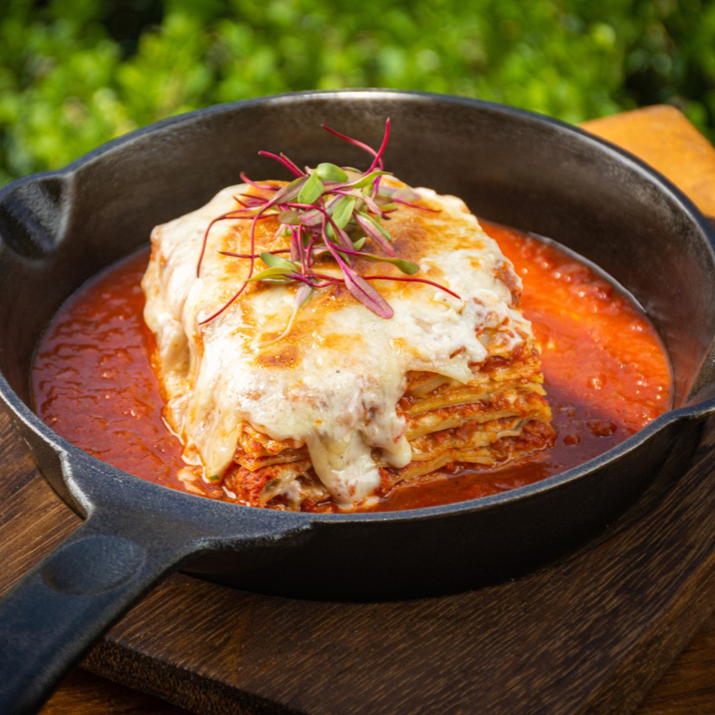 Pasta hecha en casa, salsa bechamel, salsa bolognesa, gratinada al horno de leña