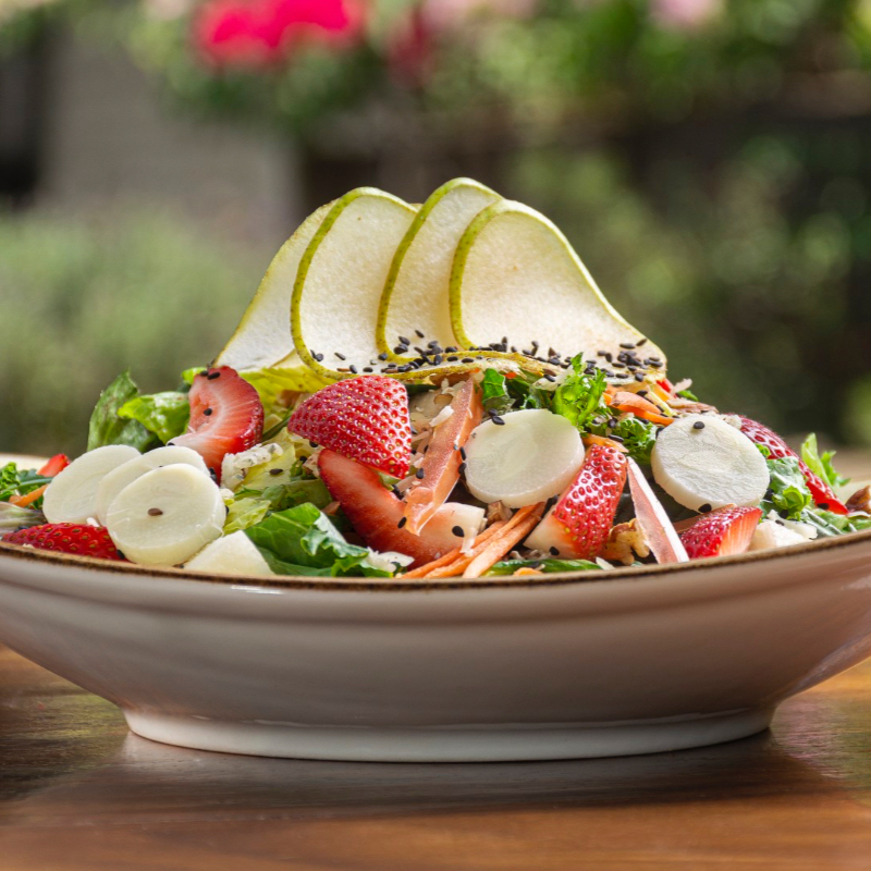 Mix de lechugas mixtas con pera, nuez, palmitos, lluvia de queso Gorgonzola, aderezo de miel y mostaza.