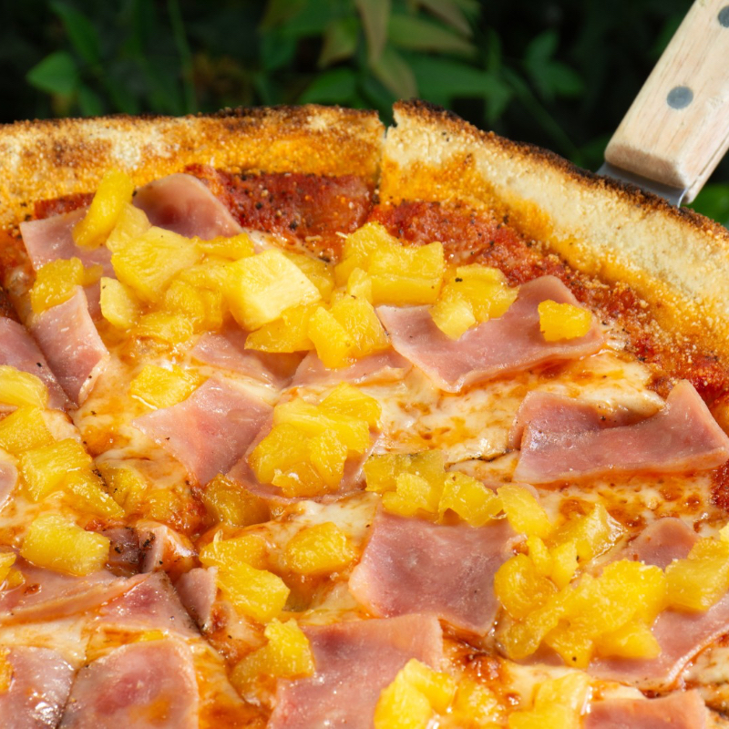 Salsa pomodoro, queso Monterrey Jack, jamón de pierna y piña en almíbar hecha en casa.