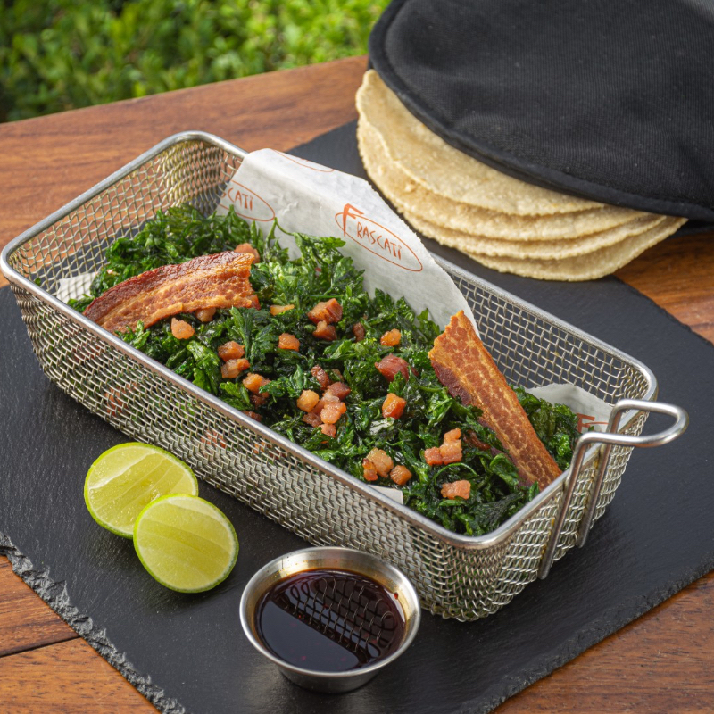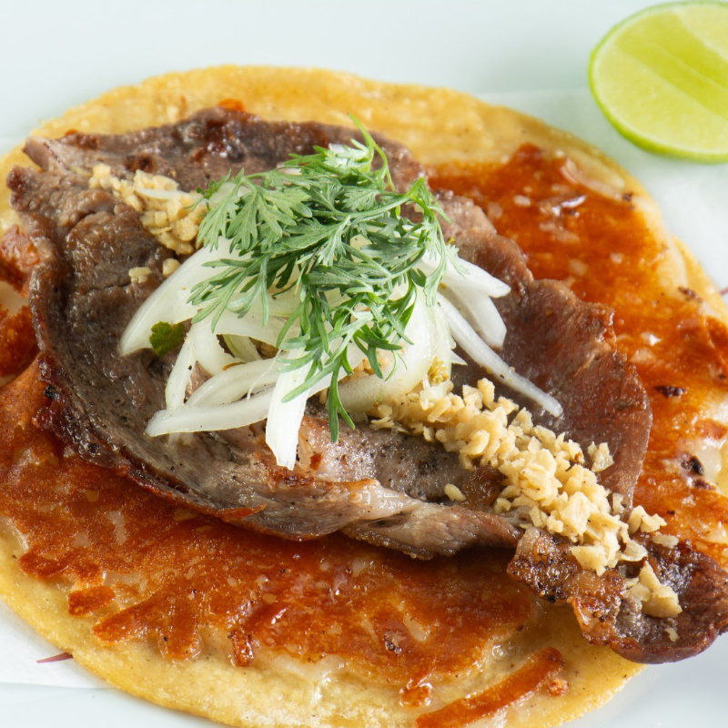 Tortilla de comal, costra de queso, maíz crujiente, cebolla encurtida y salsa verde cruda