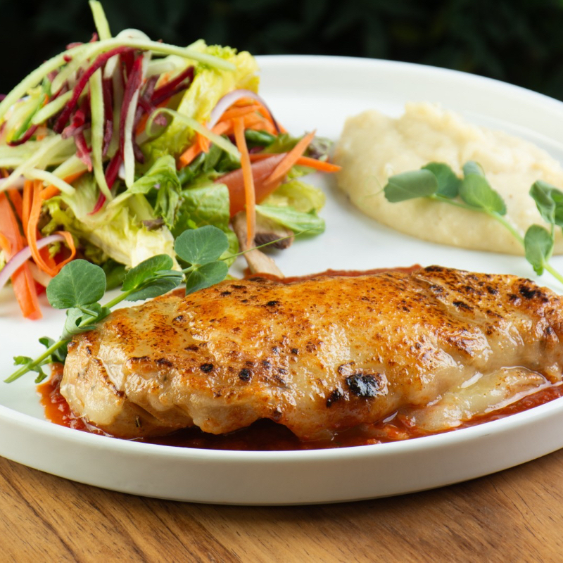 Pechuga de pollo gratinada con queso Monterrey, con salsa pomodoro, puré de papa y ensalada mixta.