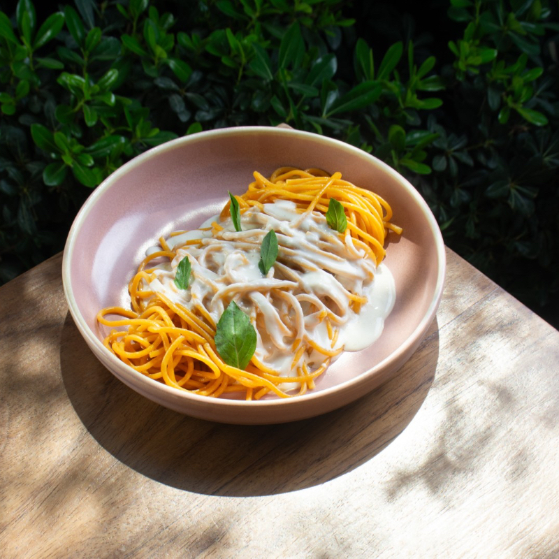 Salsa cremosa con jamón, tocino ahumado y un toque de nuez moscada.