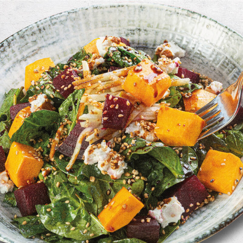 Espinaca orgánica, betabel rostizado, cubos de mango, queso cabra y vinagreta de balsámico.
