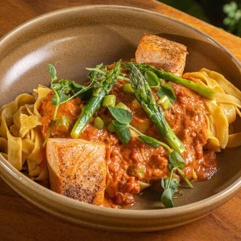 Salsa cremosa napolitana con chipotle, tocino ahumado, salmón a la parrilla (100 gm) y espárragos.