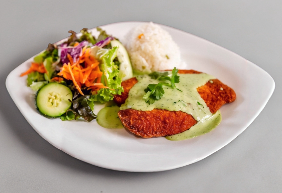 Pechuga empanizada bañada en salsa poblana, arroz y ensalada.