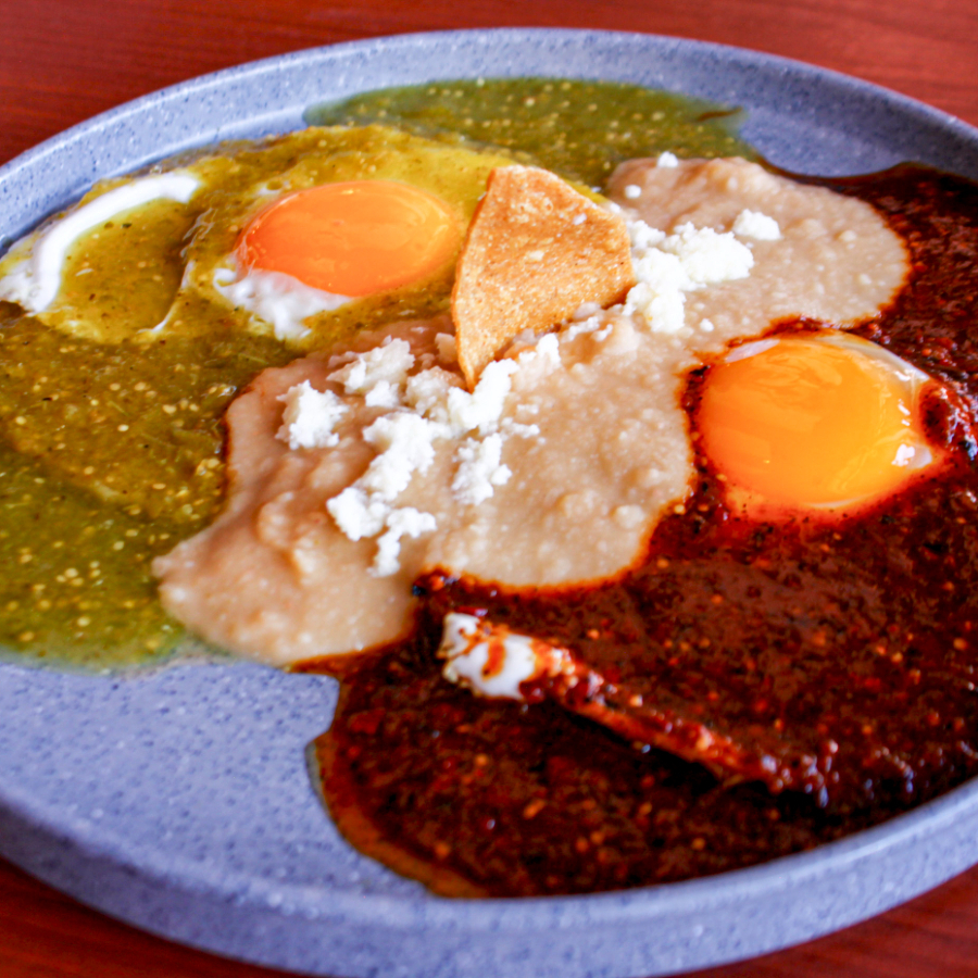 2 huevos estrellados con una cama de tortilla bañados en salsa roja/verde con frijoles.