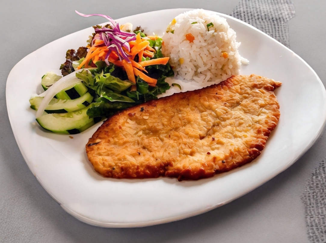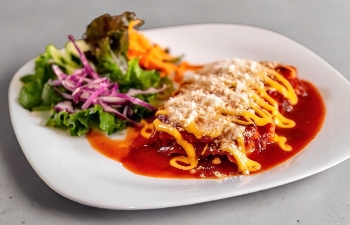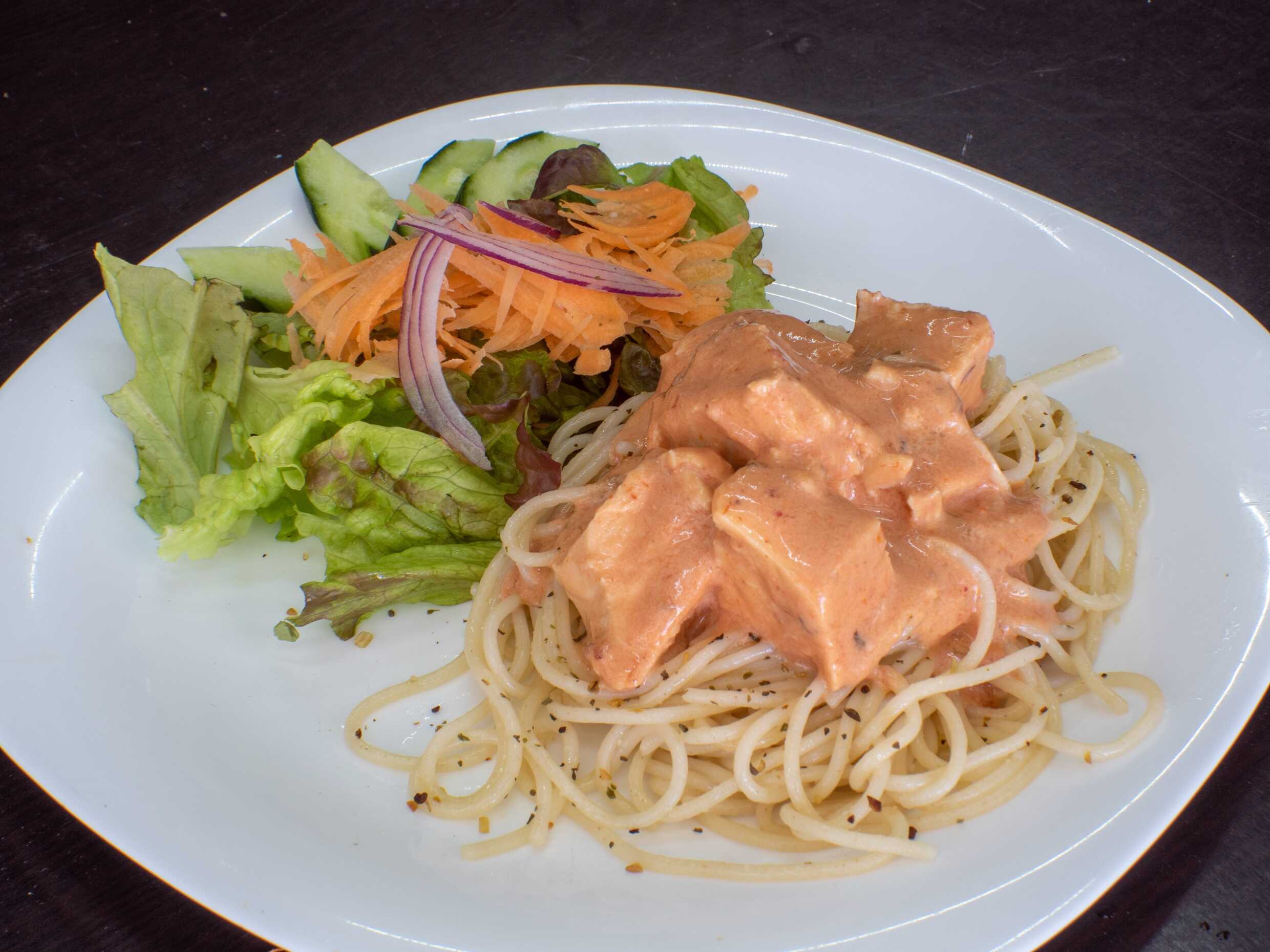 Espagueti, pechuga de pollo en salsa chipotle y ensalada.