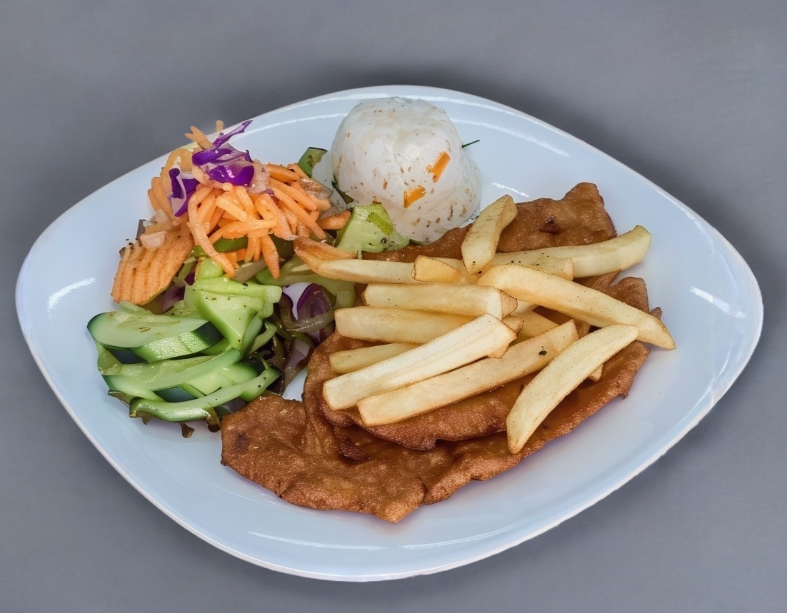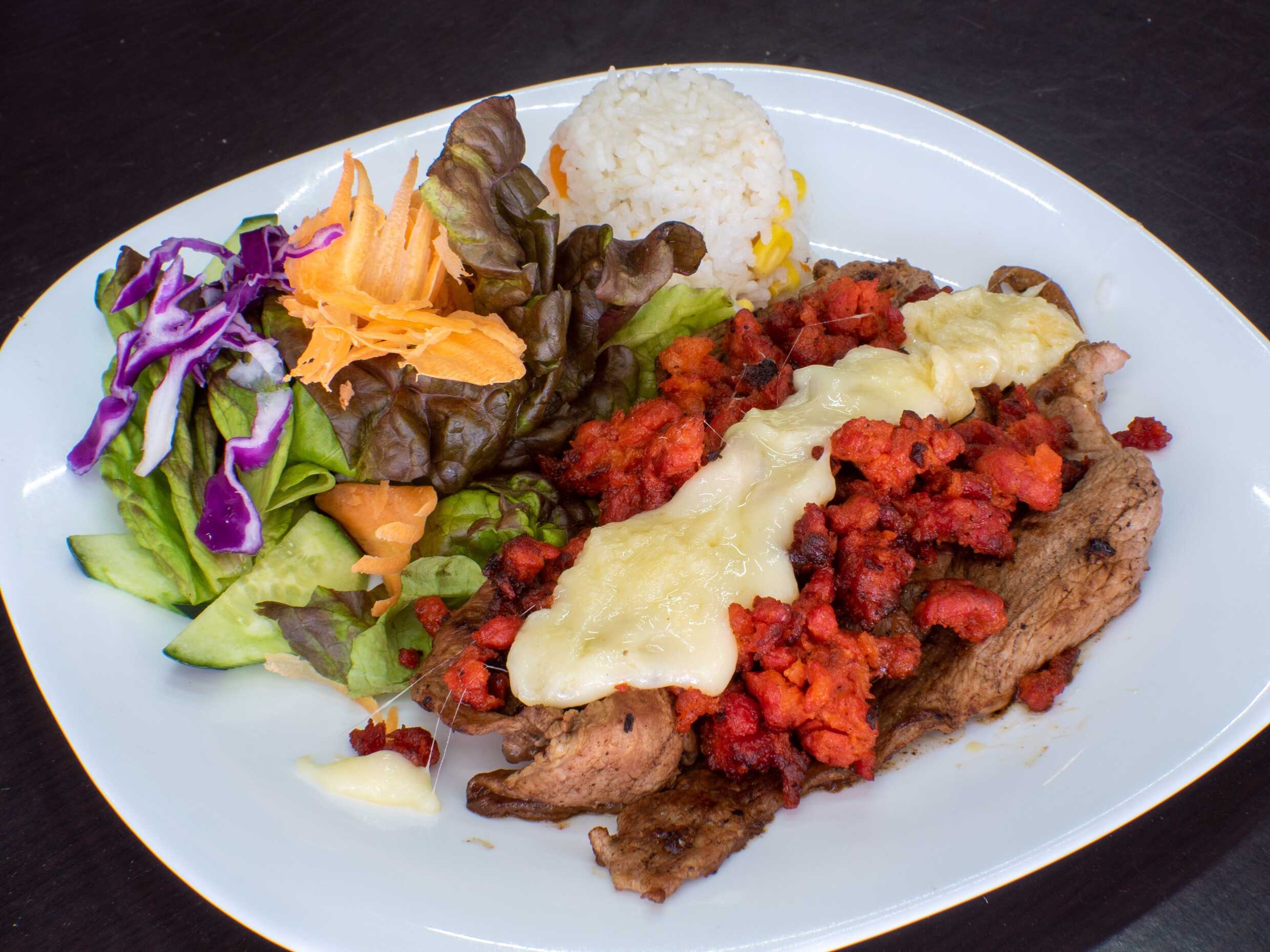 Bistec, chorizo, queso chihuahua, arroz y ensalada.