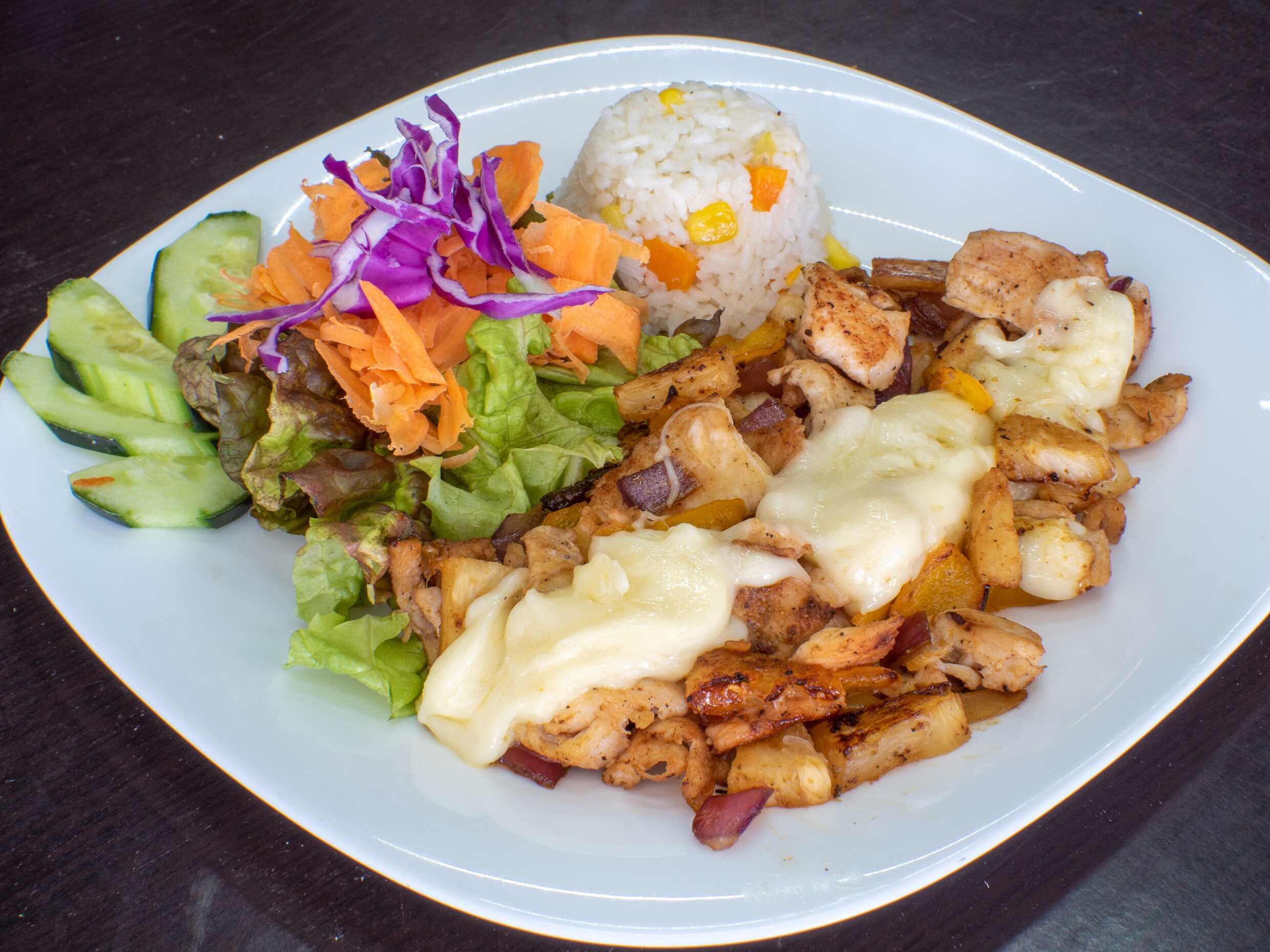 Queso chihuahua, piña, tocino, pimientos, arroz y ensalada.