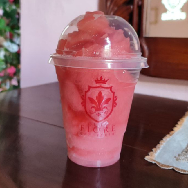 Base de leche, hielo, trozos de gansito, mermelada de fresa, crema batida y chispas de chocolate