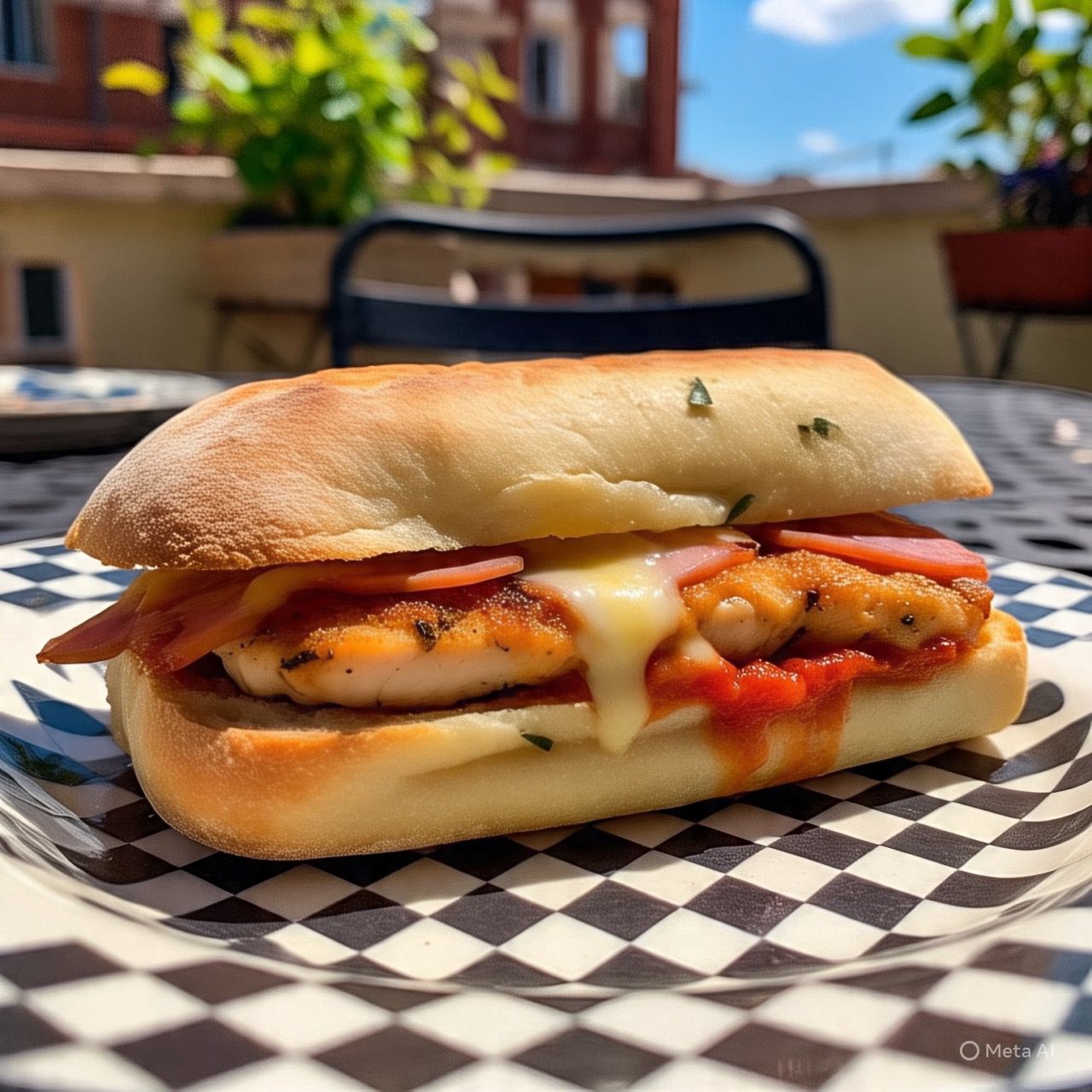 Pan artesanal milanesa de pollo empanizado, salsa de tomate, jamón y gratín de queso.