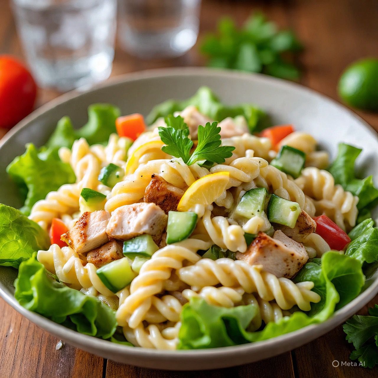 Pasta cremosa fría, toque de pimiento, elote, jitomate, pepino, elote, sobre cama de lechuga y ralladura de zanahoria, pollo a la plancha o atún a elegir.
