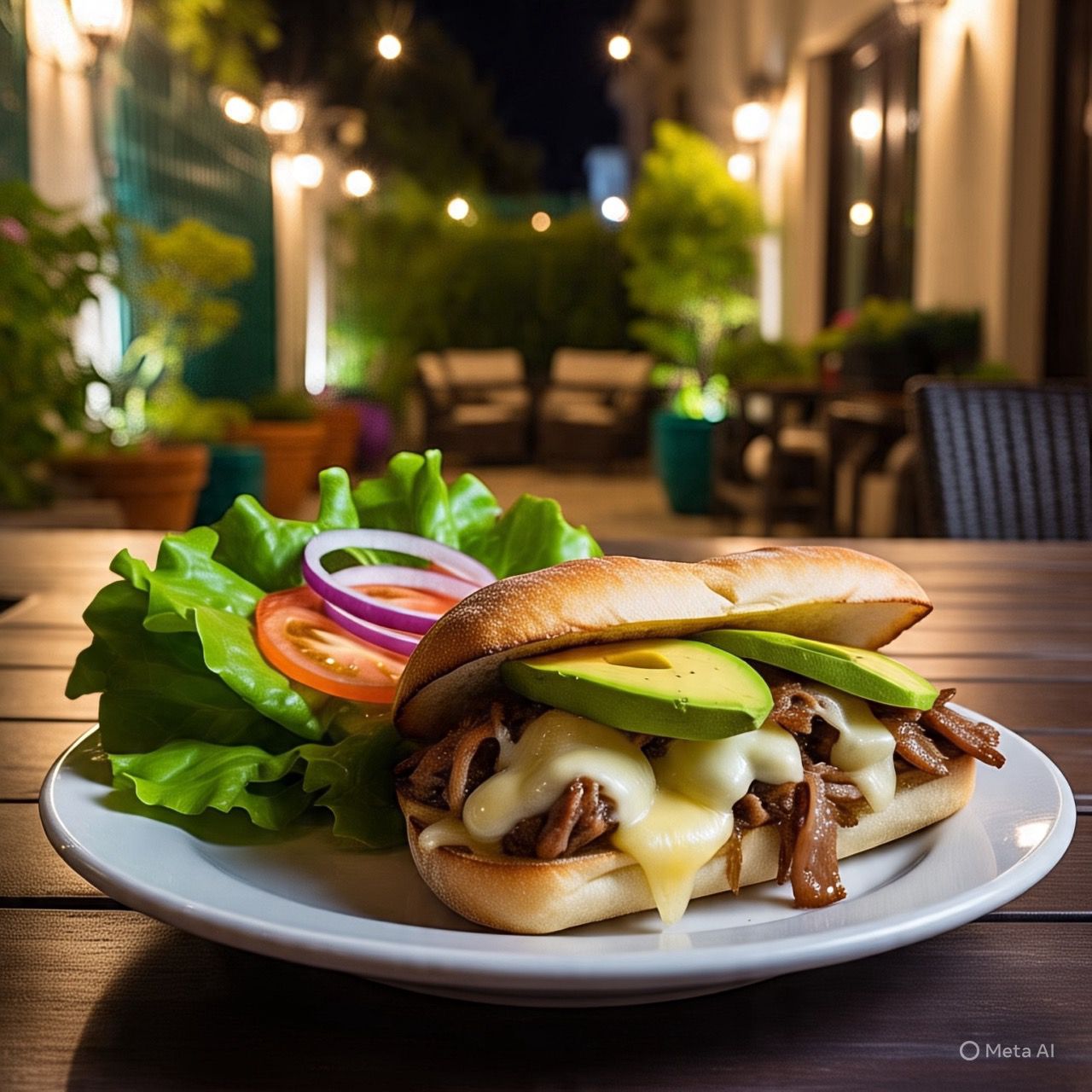 Pan artesanal, arrachera, jamón, aguacate y vegetales aparte.