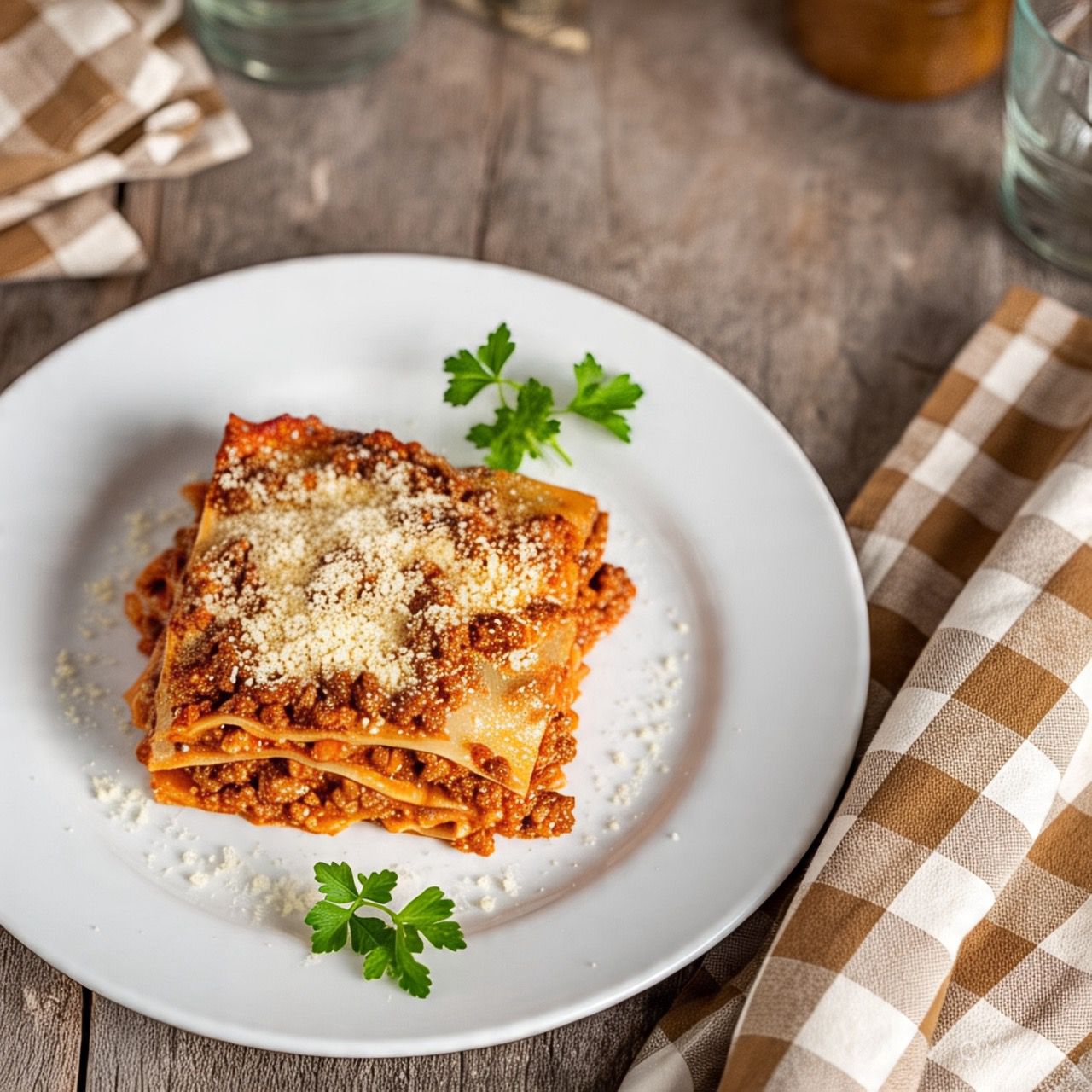 Láminas de pasta hecha en casa, guisado de carne con puré de jitomate y especias italianas, entre capas, salsa bechamel, para terminar un gratín de queso. Parmesano y perejil.