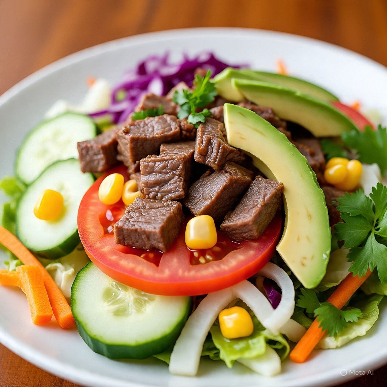 Mezcla de lechugas, arrachera, ralladura de jícama, zanahoria, col morada, pepino, jitomate rebanado y un toque de elote. Tiritas de tortilla y aguacate incluye en aderezo de la casa (cilantro).