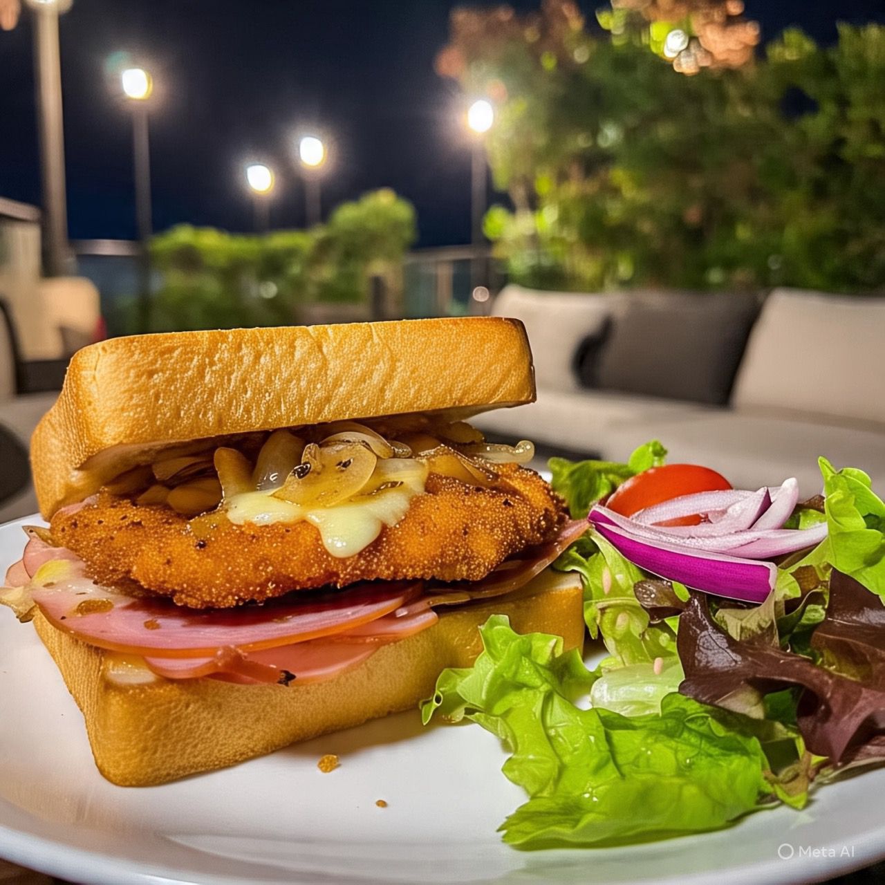 Pan masa madre, pechuga de pollo empanizado, jamón de pierna, queso americano, vegetales y aderezo aparte.