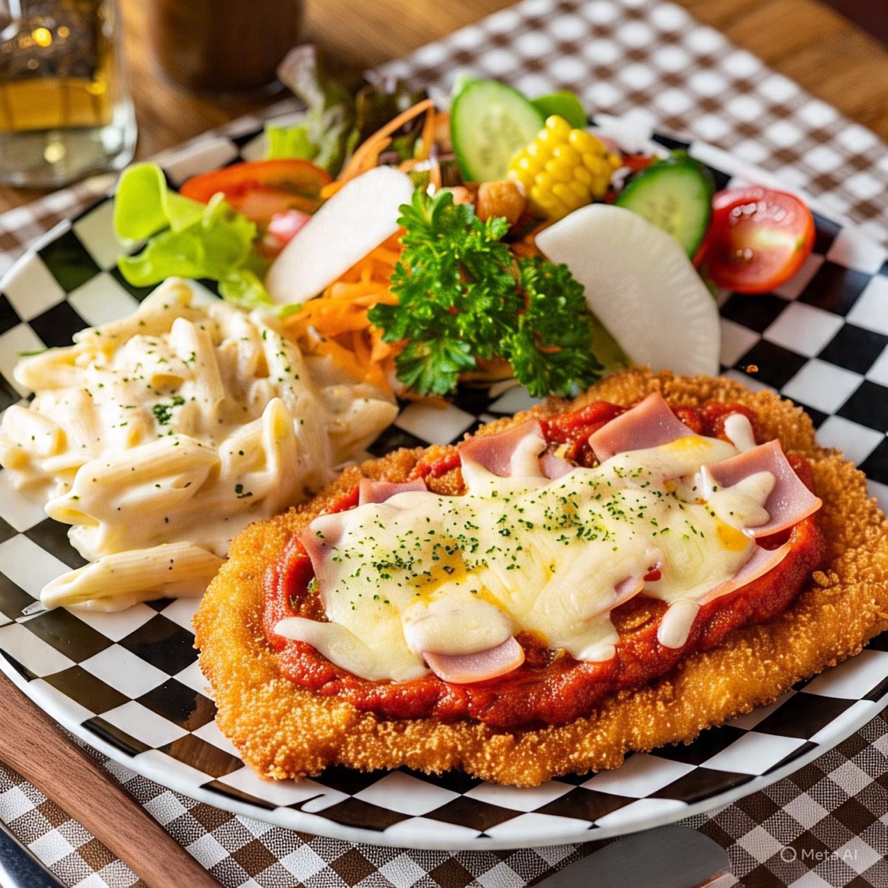 Pechuga de pollo empanizada, puré de jitomate italiano, jamón y gratín de queso. Acompañada de pasta cremosa y ensalada mixta.