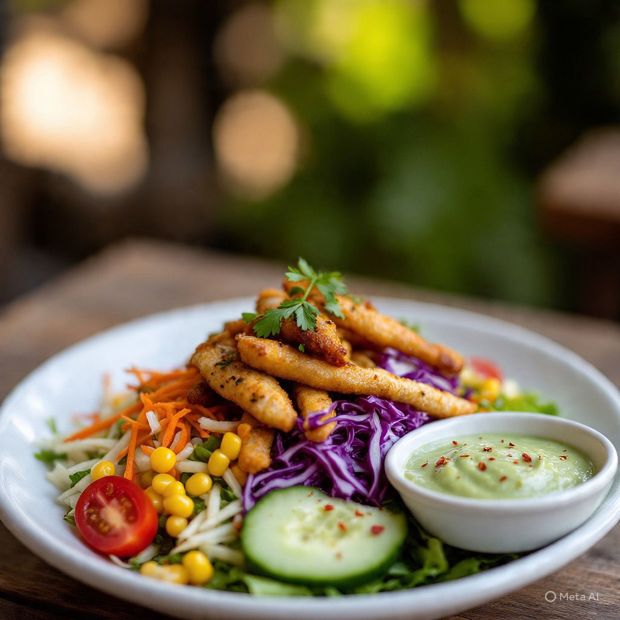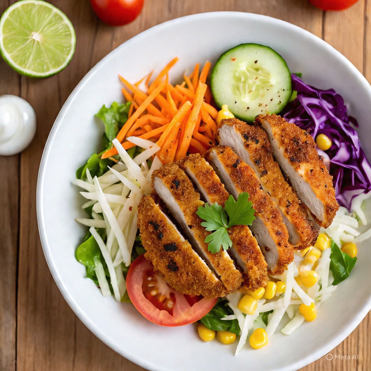 Mezcla de lechugas, pechuga de pollo empanizado, ralladura de jícama, zanahoria, col morada, pepino, jitomate rebanado y un toque de elote. Incluye en aderezo de la casa (cilantro).
