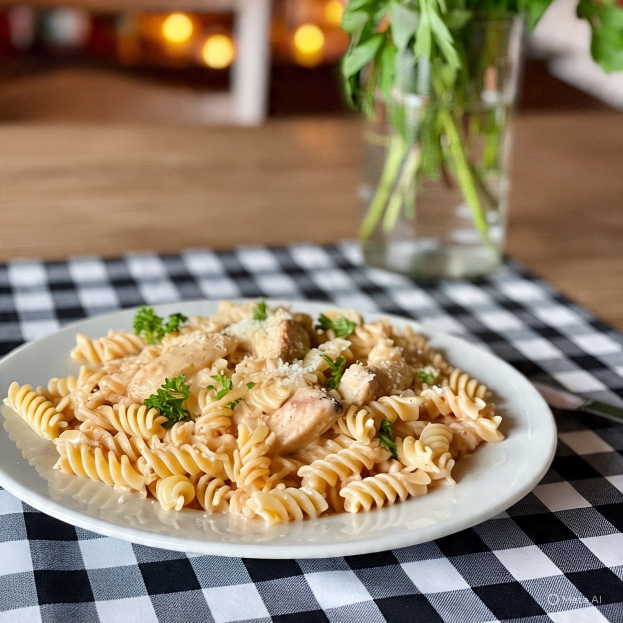 Pasta cremosa con un toque especial, fusionando de mantequilla con un ligero toque de chipotle, tocino y pechuga de pollo como tópico. Parmesano y perejil.