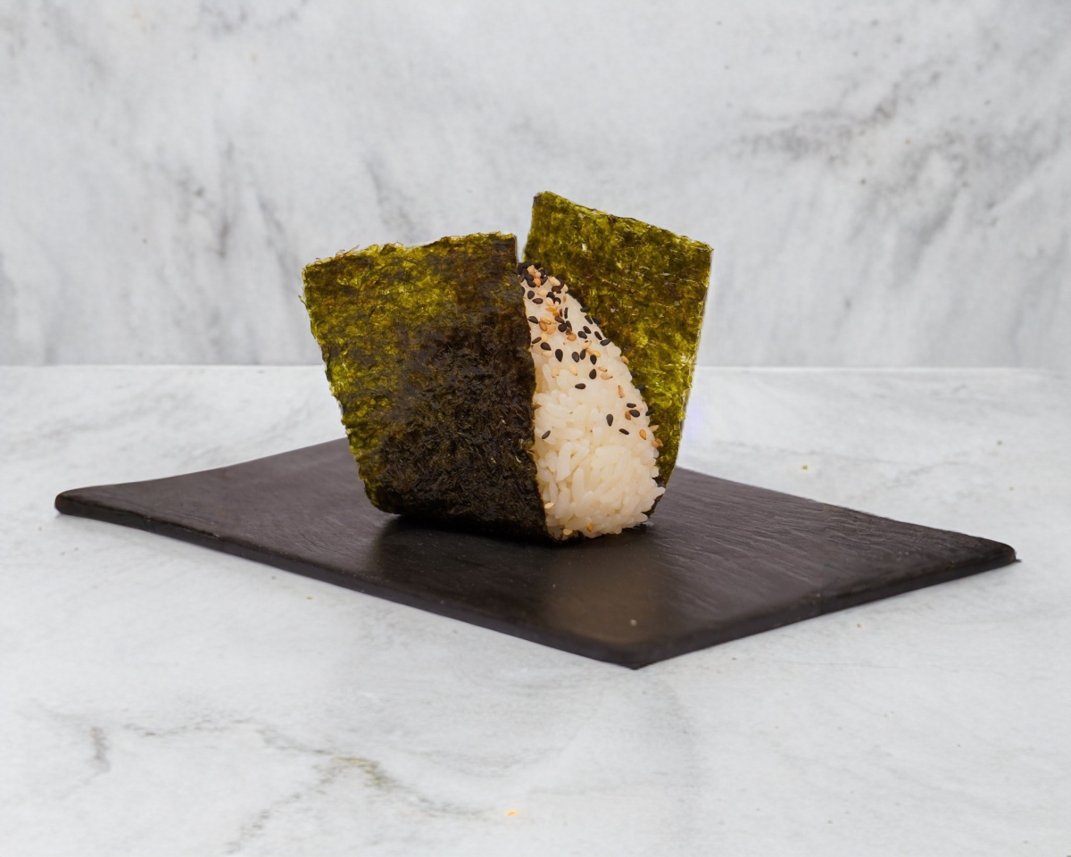 Bola de arroz tradicional japonesa en forma triangular rodeada por alga nori