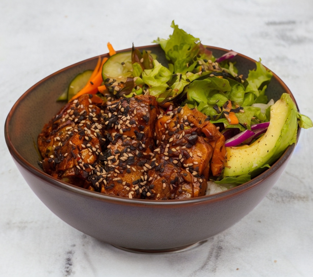 Pollo salteado en salsa teriyaki, acompañado de arroz, ensalada verde, aguacate y aderezo de ajonjolí