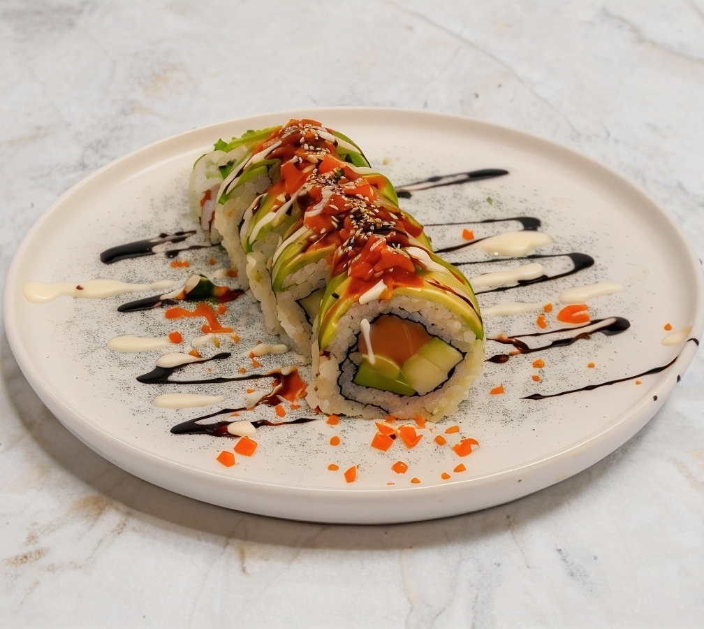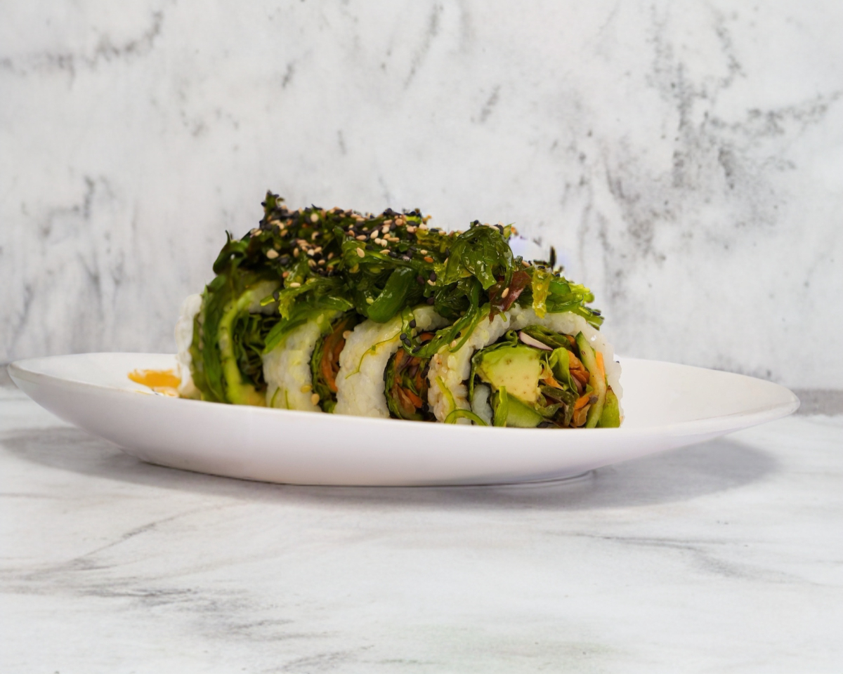 10 piezas de rollo estilo california (alga por dentro) relleno de ensalada verde, aguacate y pepino, con topping de alga marina