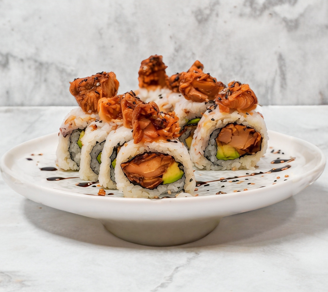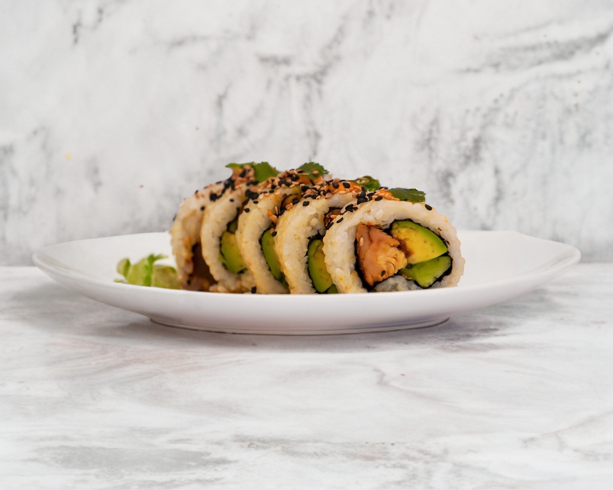 10 piezas de rollo estilo california (alga por dentro) relleno de pollo teriyaki, aguacate y pepino