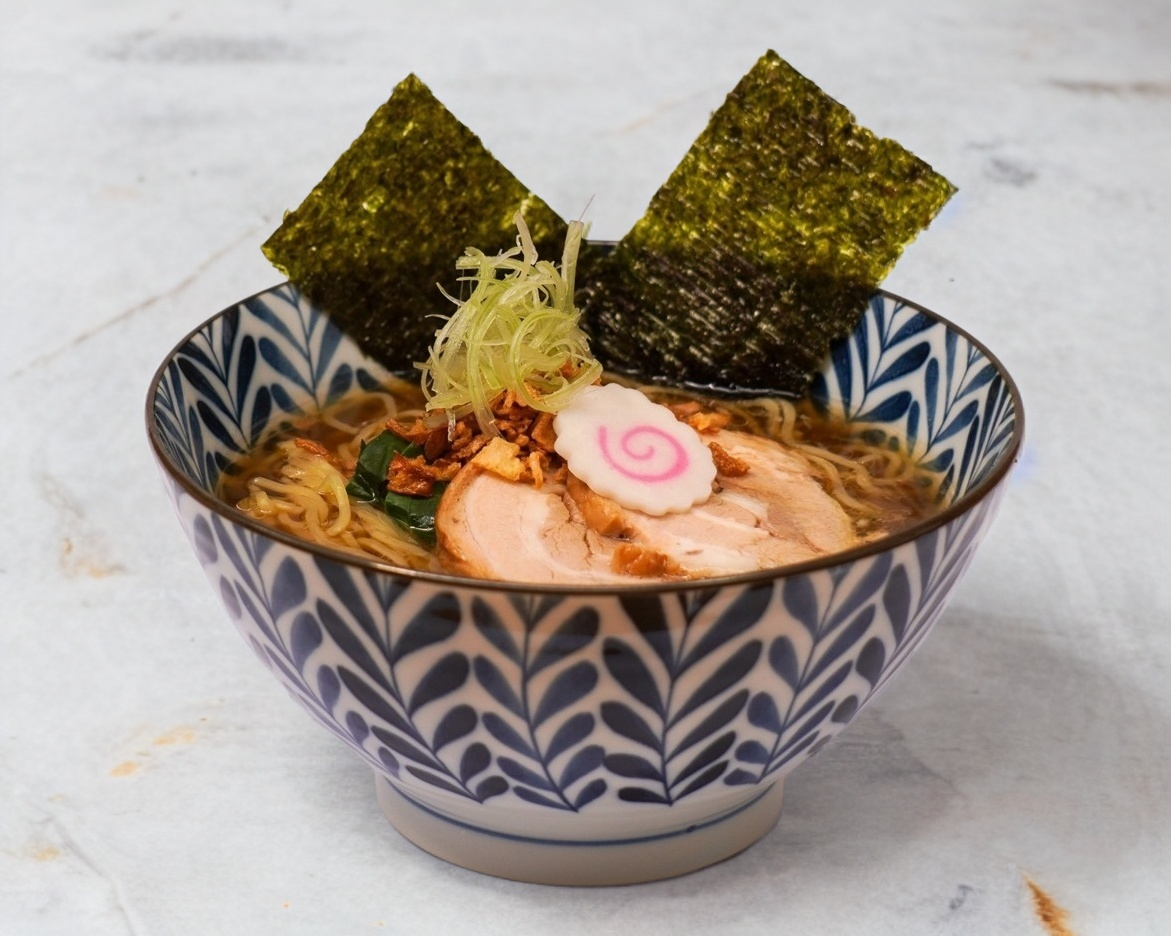 Fideos en fondo especial de pollo con sabor a soya acompañado de rebanadas de Chasu (puerco estofado), acelga, cebollín y alga nori