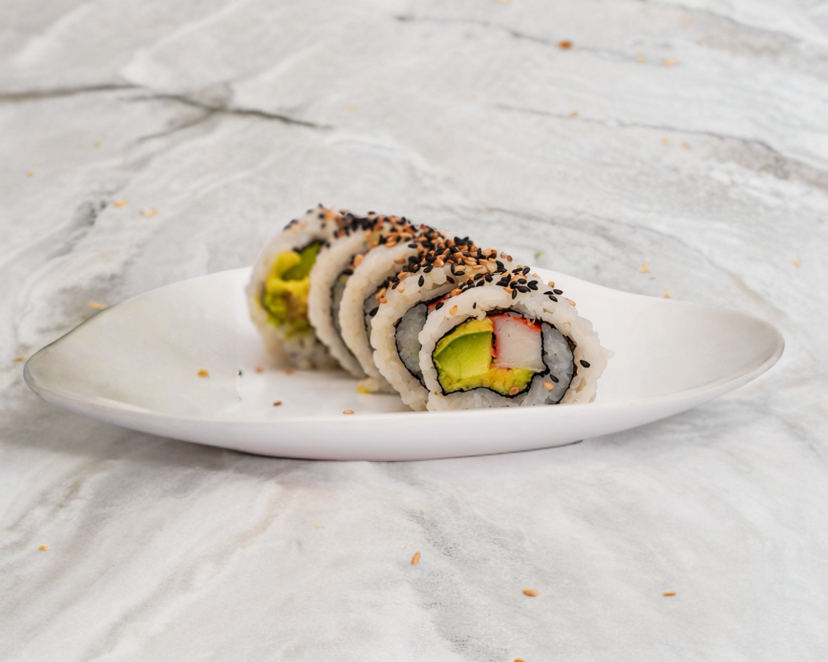 10 piezas de rollo estilo california (alga por dentro) relleno de surimi, aguacate y pepino