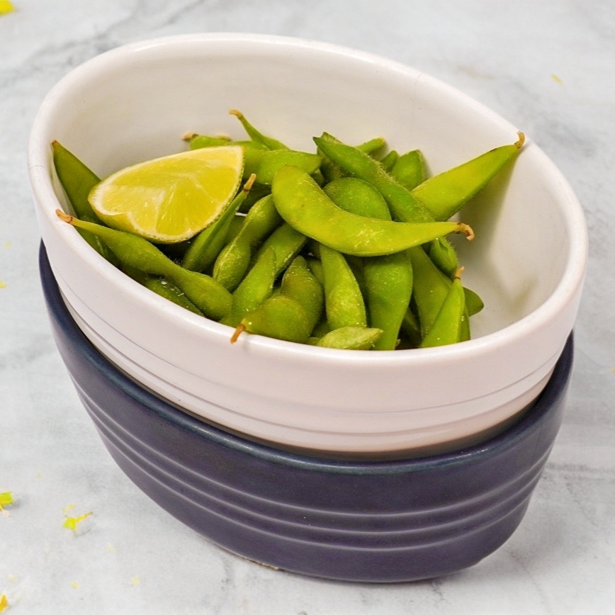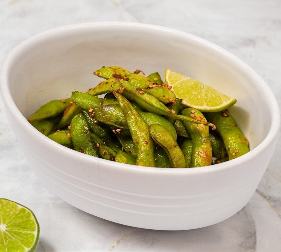Tierna vaina de soya cocida, sazonada con mojo de ajo, soya y ajonjoli blanco