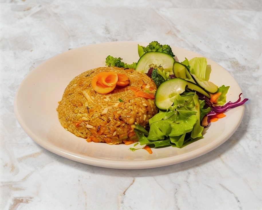 Arroz frito con verduras y sazonado con salsa de soya acompañado con ume (ciruela japonesa)