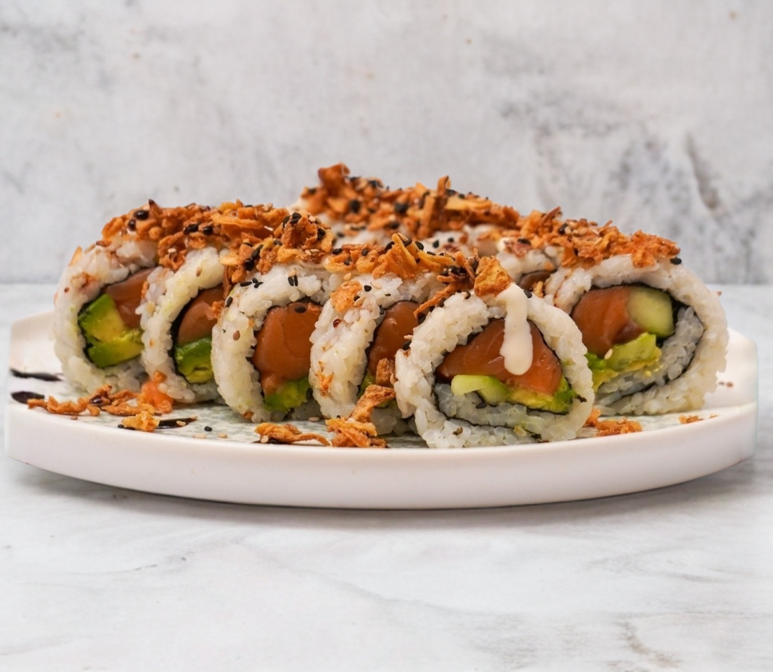 Rollo california de salmón con cubierta de cebolla frita
