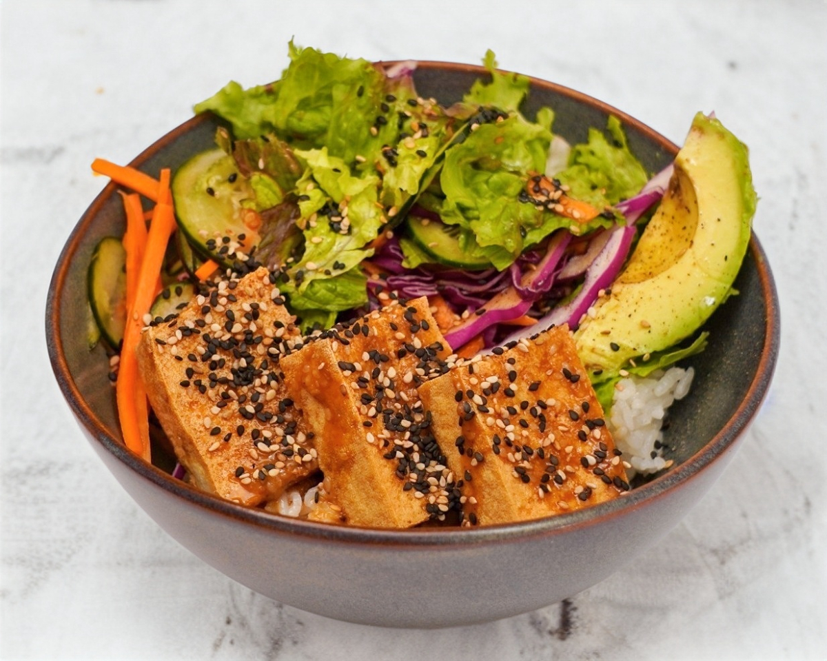 Tofu frito en salsa de ajonjoli, acompañado de arroz, ensalada verde y aguacate